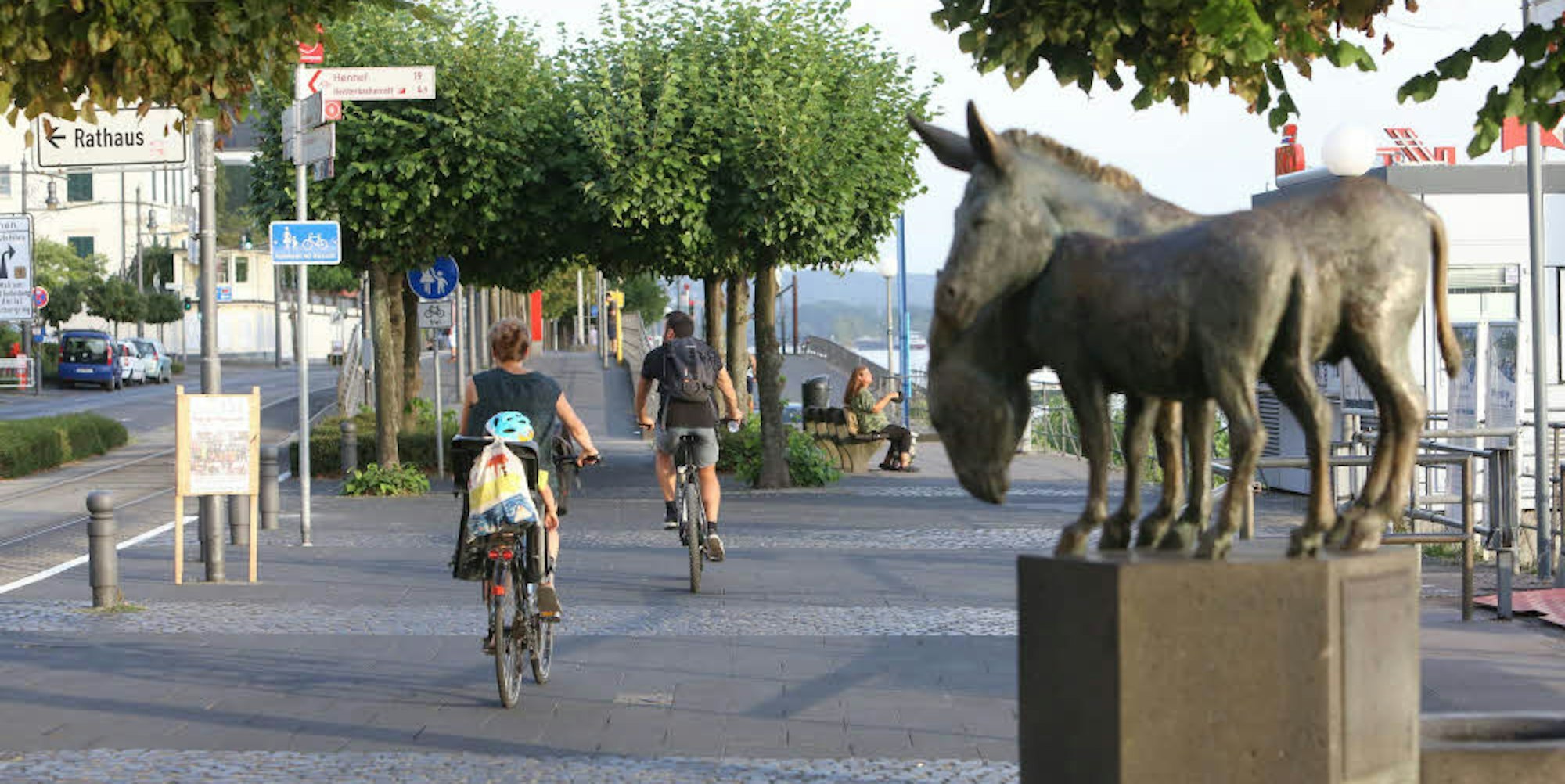 Königswinter – Auf einem genau 1900 Meter langen Abschnitt der Königswinterer Rheinpromenade ist für Radfahrer künftig Schrittgeschwindigkeit vorgeschrieben. Vier bis sieben Stundenkilometer – mehr ist zwischen der Longenburg und der Haltestelle Denkmal in Zukunft nicht mehr erlaubt. In Höhe des Eselsdenkmals und der Rheinfähre dürfen sie sogar überhaupt nicht mehr fahren, sondern müssen absteigen und schieben. Und wenn die Radler sich nicht an diese neuen Vorschriften halten, dann könnte ihnen im Herbst sogar die komplette Sperrung des Rheinufers auf den knapp zwei Kilometern drohen.