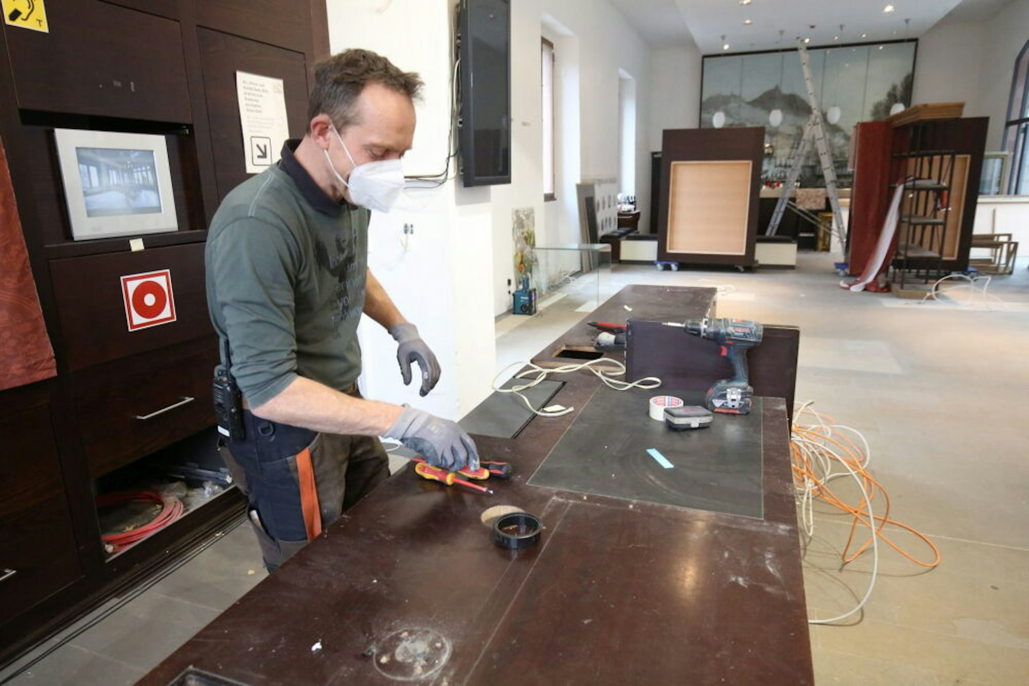 Der Kassen- und Empfangstresen wird verlängert und für Rollstuhlfahrer unterfahrbar: Schlossmeister Holger Grebert bei der Arbeit,
