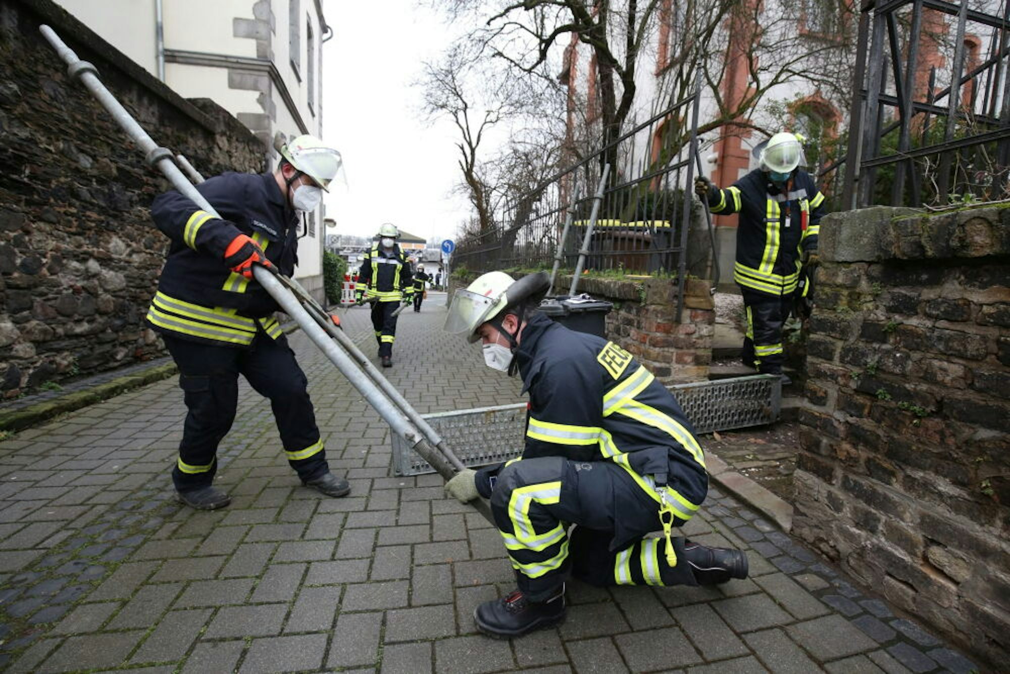 Mitglieder des Feuerwehr-Löschzugs Altstadt errichteten vorsorglich schon am Sonntag Stege, damit Anwohner trockenen Fußes in ihre Wohnungen kommen.