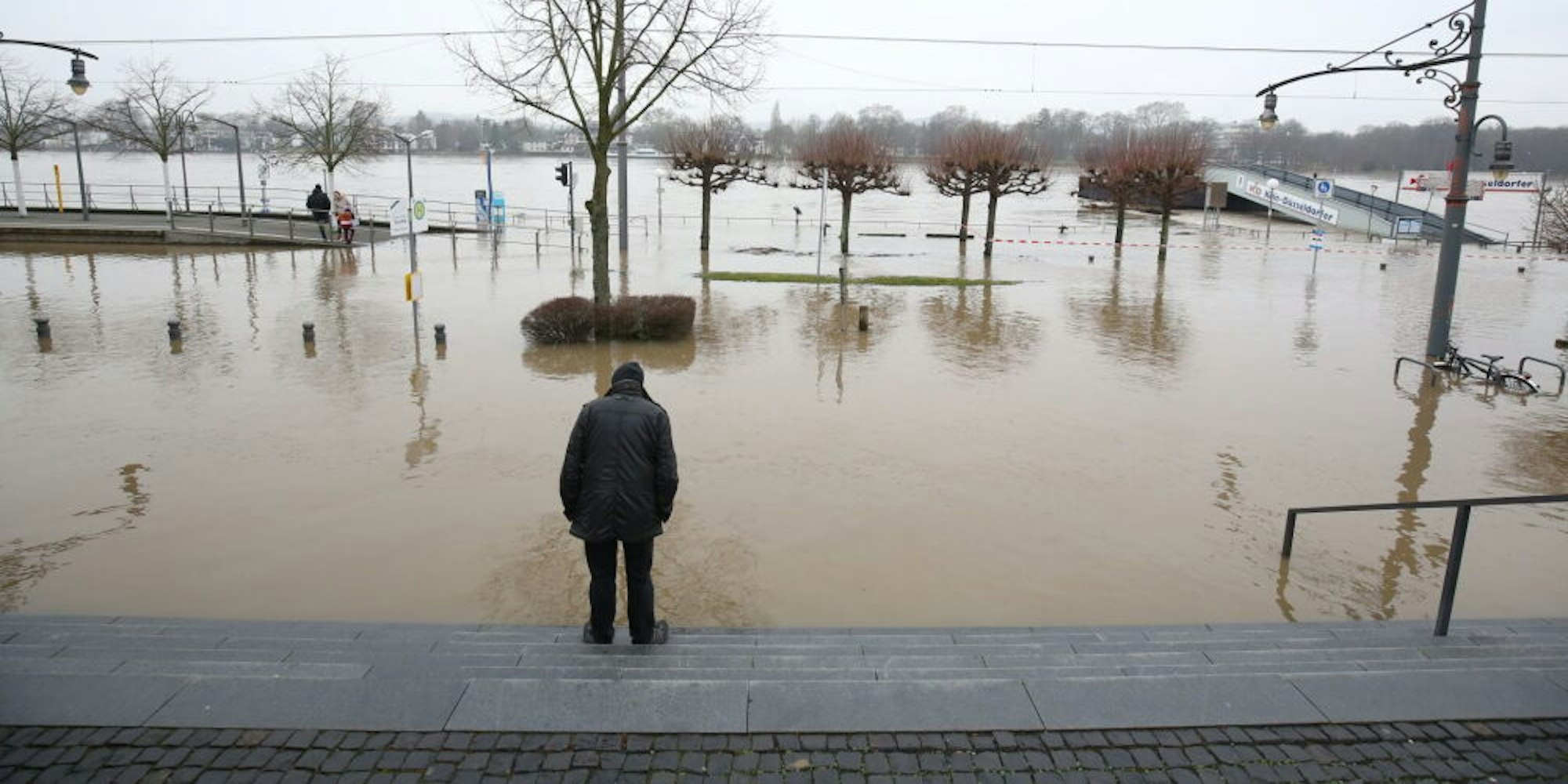 Die Rheinallee in der Altstadt steht unter Wasser. Die Stadtbahnlinie 66 aus Siegburg beziehungsweise Bonn fährt daher nur noch bis zur Clemens-August-Straße in Königswinter. Zur Endhaltestelle in Bad Honnef und zurück pendeln vorerst Busse als Schienenersatzverkehr. Dass die 66 bis zur Haltestelle Oberdollendorf verkürzt werden müsste, zeichnete sich nach Angaben eines Stadtwerkesprechers gestern zunächst nicht ab.