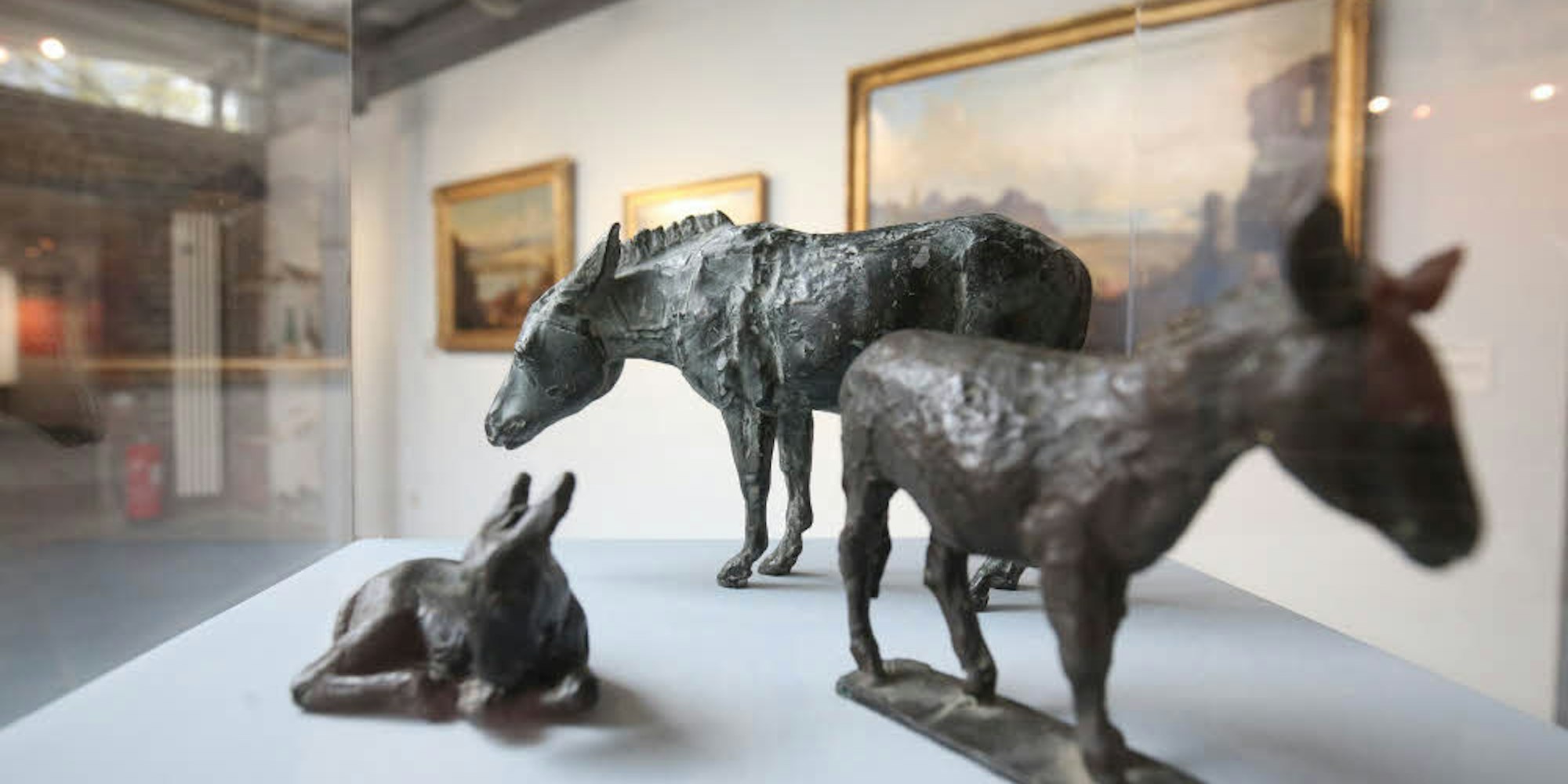Skulpturen, Gemälde und vieles mehr: Die Ausstellung stellt den Esel in vielen Facetten vor. Das Foto zeigt drei Eisen aus Bronze, die im Jahr 1980 von Ernemann Sander gefertigt wurden.