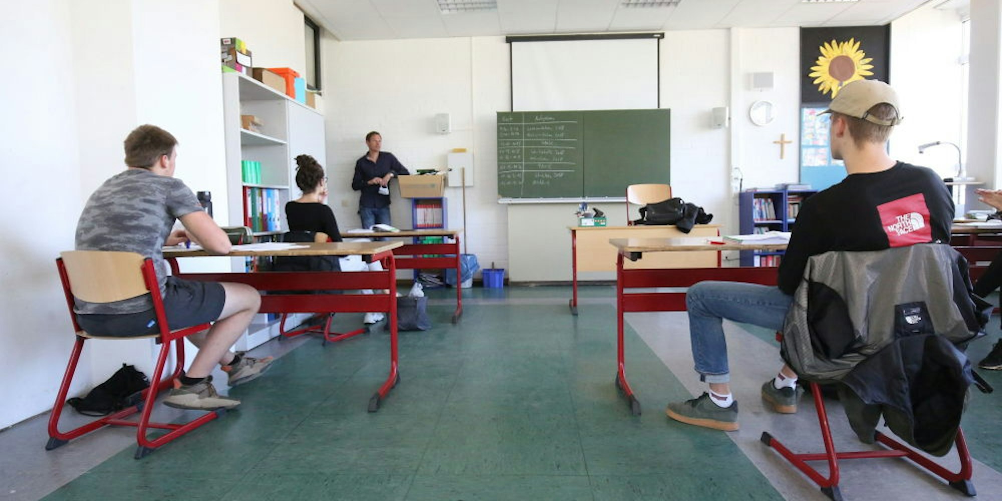 Königswinter – „Händewaschen vor und nach der Pause!“, steht in einem Klassenzimmer im ersten Stock der CJD-Schule Königswinter an der Kreidetafel. Eine Handvoll Schülerinnen und Schüler büffelt dort konzentriert an einer Englisch-Aufgabe – jeder an seinem eigenen Tisch und mit ausreichend Abstand zum Nebenmann. Neben dem Waschbecken liegen Handtücher und Seife bereit, an der Tür hängt ein Plan mit fest zugewiesenen Sitzplätzen. Türen und Fenster stehen offen, aus dem Flur dringt Stimmengewirr in den Raum.