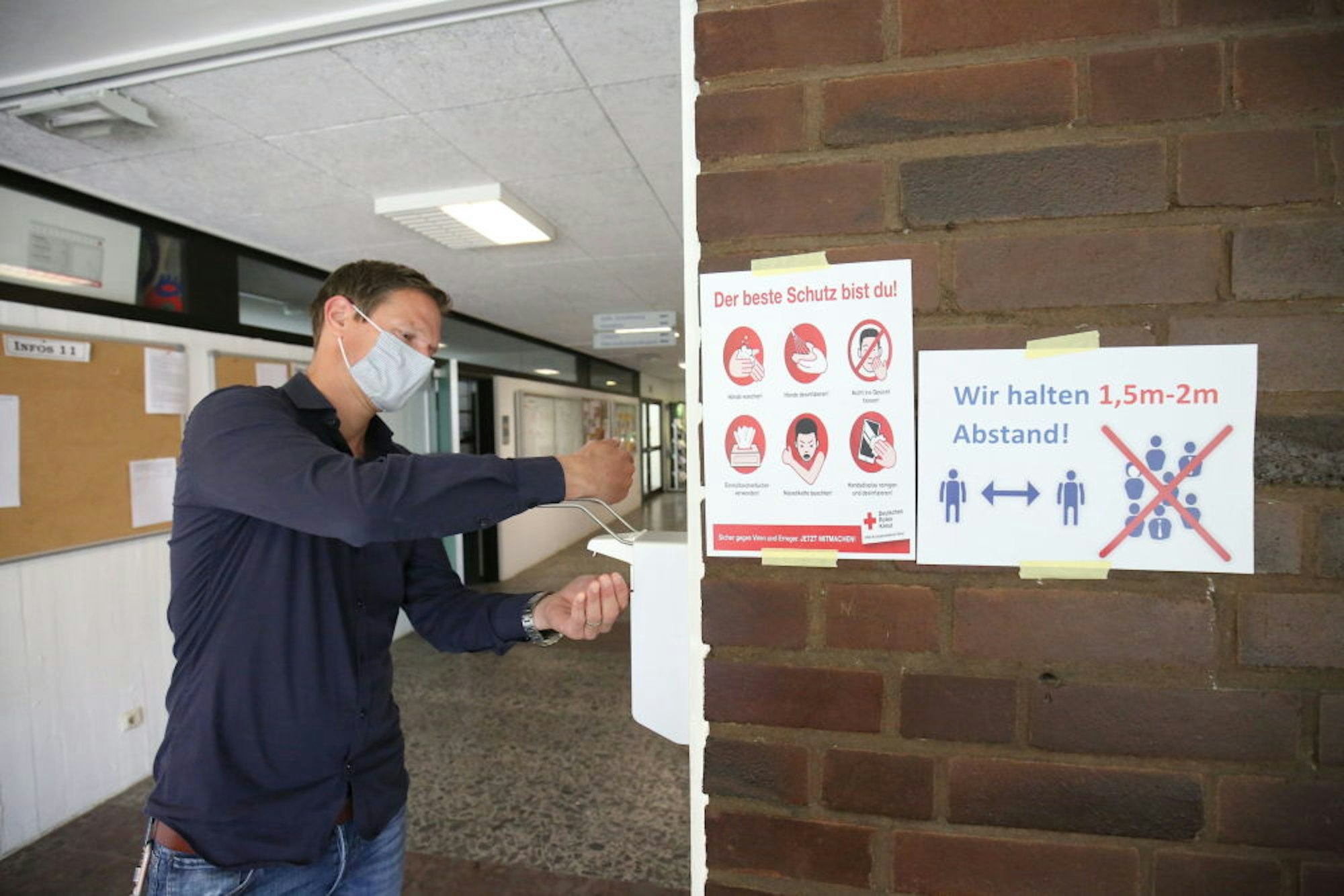 Hygiene ist das A und O in Corona-Zeiten: Realschulleiter Martin Krude an der Desinfektionsstation.