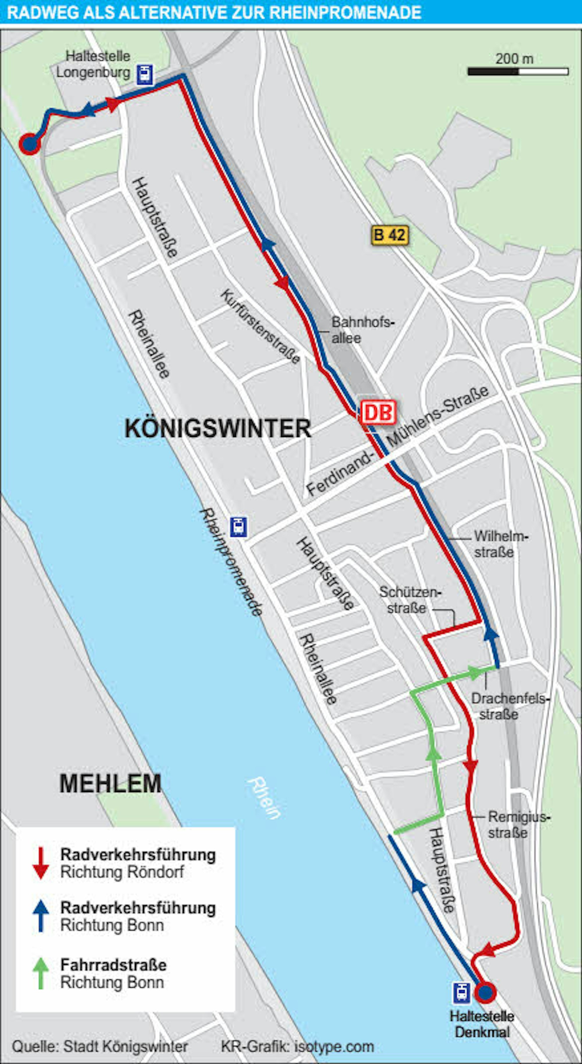 Der zuständige Verkehrsausschuss hat eine Kombilösung beschlossen: Einerseits bleibt es erstmal bei der Fußgängerzonenregelung, zum anderem weist die Stadt aber eine Alternativroute durch die Altstadt aus, die unter anderem über die Hauptstraße und die Drachenfelsstraße führen soll, die dafür als „Fahrradstraße“ ausgeschildert werden, sowie über die Bahnhofsallee zwischen CJD-Schule und Bahntrasse (siehe Grafik).