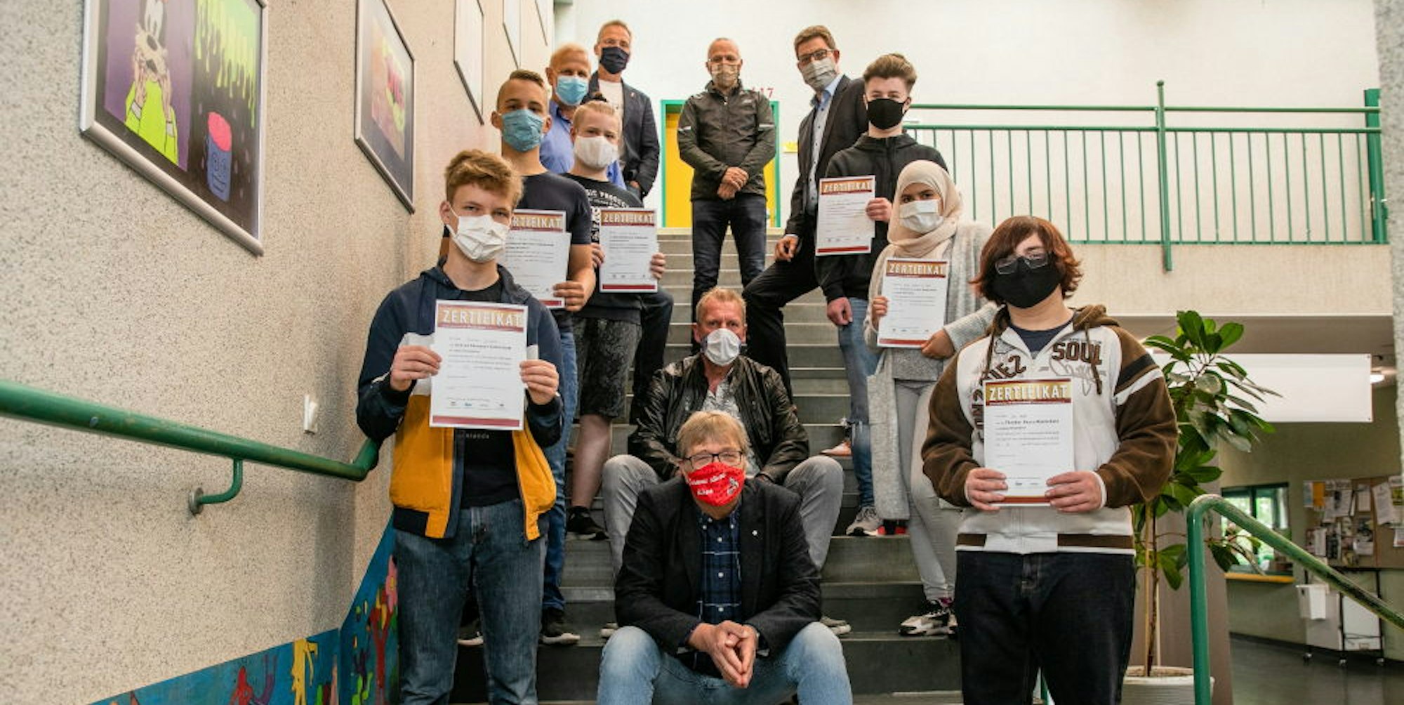 Kreishandwerksmeister Thomas Radermacher (vorne Mitte) sowie die Schulleiter Peter Hauck (hinter Radermacher) und Dirk Bahrouz (rechts oben) übergaben die Zertifikate.