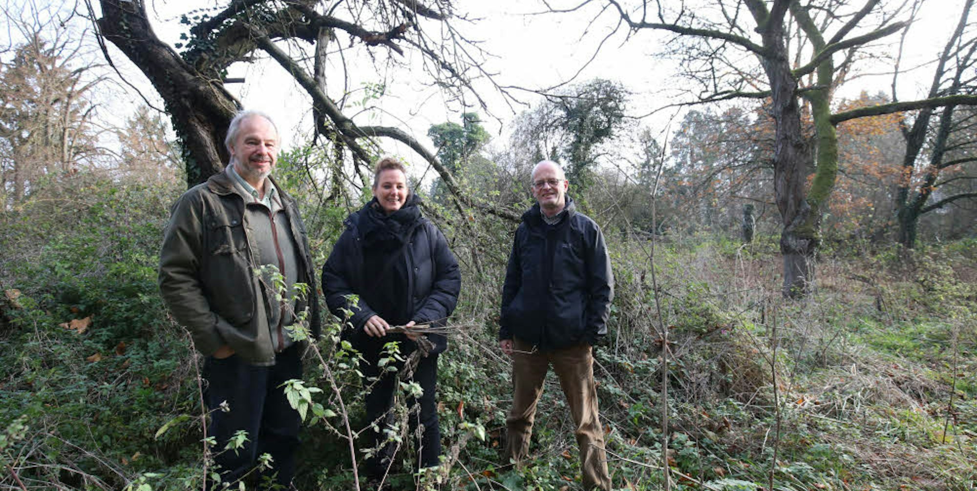 Dr. Dieter Steinwarz und Xenia Scherz von der Biologischen Station sowie Pfarrer Markus Hoitz (von links) im verwilderten Propsteigarten.