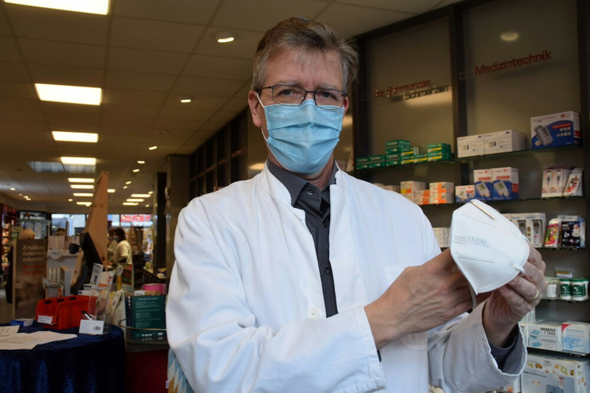 Am ersten Ausgabetag hieß es auch vor der Bornheimer Donatus-Apotheke erst einmal Schlange stehen auf dem Peter-Fryns-Platz „Zum Glück brachten unsere Kunden Verständnis und Geduld mit“, berichtete Inhaber Dr. Markus Reiz, der auch Vorsitzender des Apotheker-Verbandes Bonn/Rhein-Sieg ist.