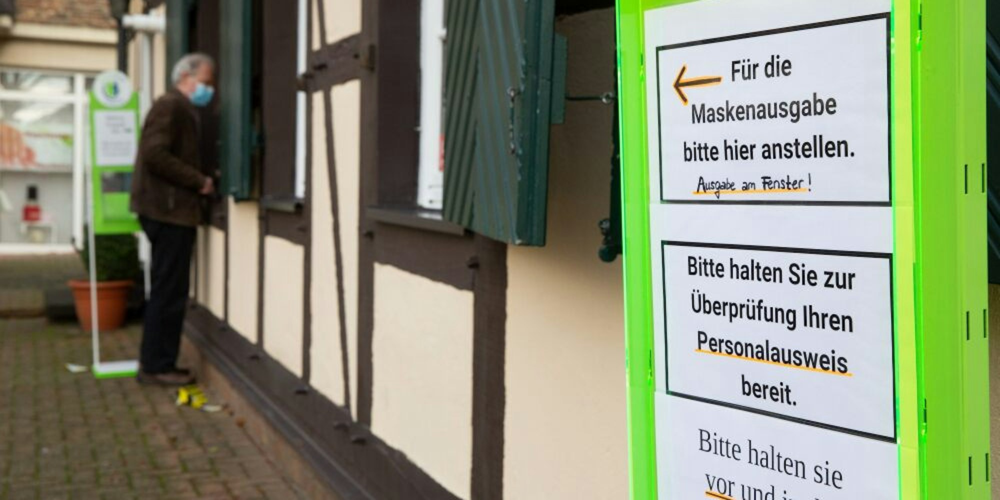 In einer Apotheke in Heimerzheim wurden die Masken am Fenster ausgegeben.