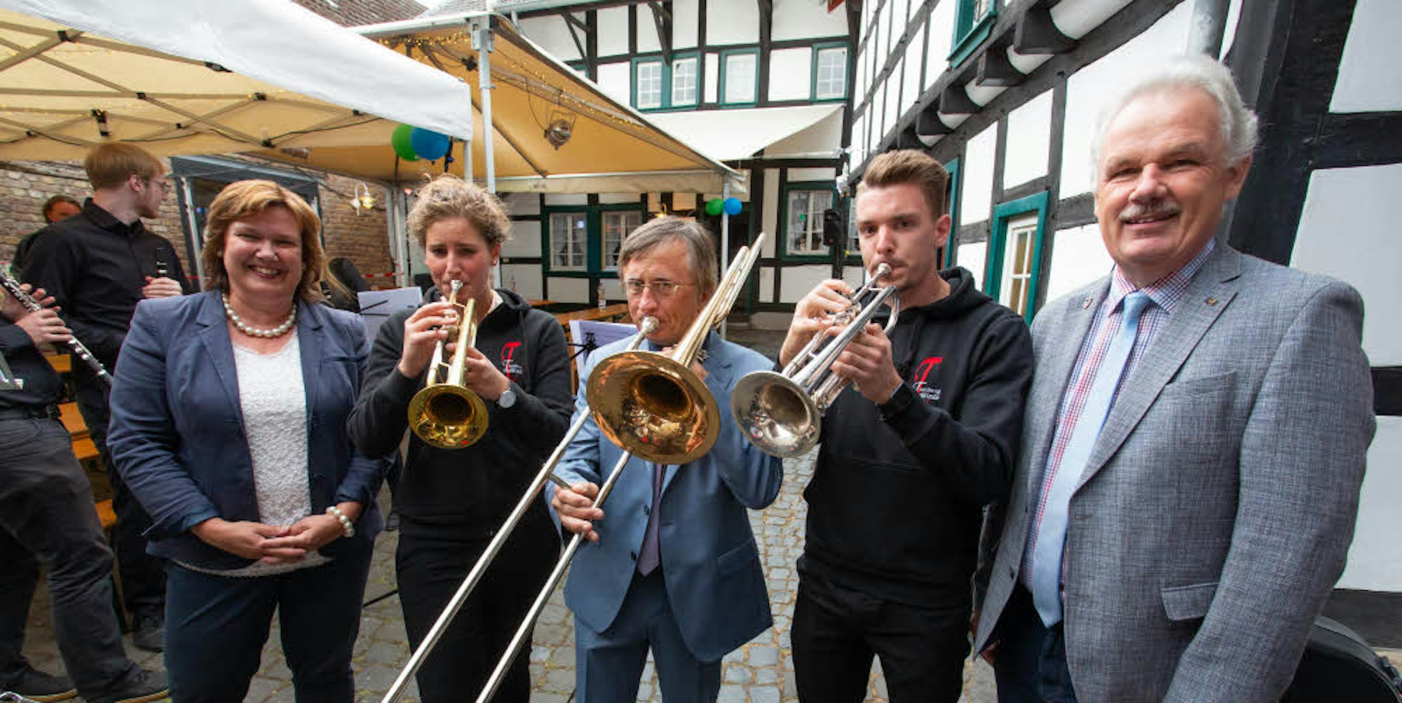 Claus Kratzenberg (M.) wurde von Barbara Hausmanns, Stefan Raetz und den Tomburg Winds in den Ruhestand verabschiedet.