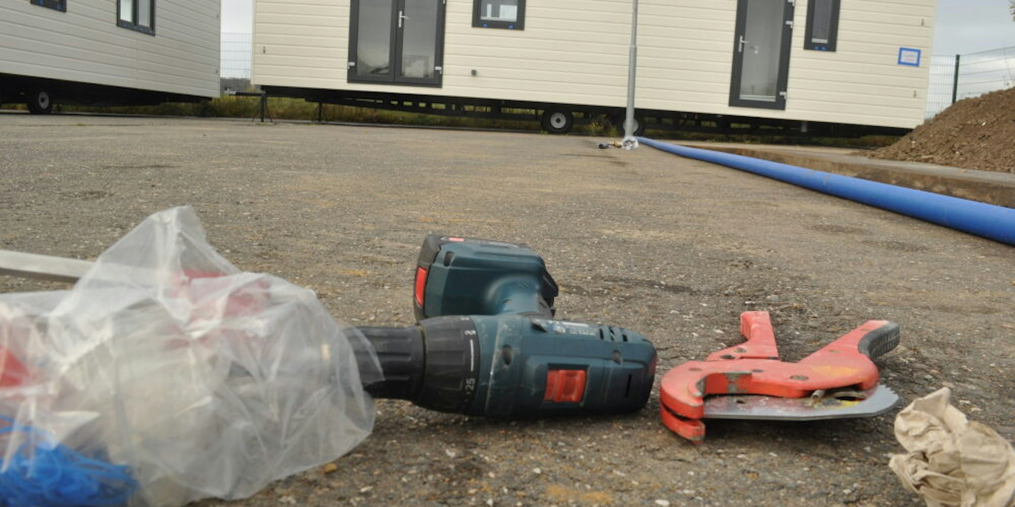 Handwerker legten am Dienstag Elektro- und Wasserleitungen. Telefonkabel sind ausgerollt und Kanalrohre liegen bereit. Der Asphaltbelag ist aufgeschlitzt und das Grabensystem für die Versorgungsleitungen ausgehoben. Trotz der Temperaturen um den Gefrierpunkt schreiten die Arbeiten voran. „Voraussichtlich in der nächsten Woche wird die Anlage fertig sein“, erklärte Matthias Müller, Sprecher der Stadt: „Die Tiny Houses werden mit Strom beheizt, die Wohnwagen mit Gas. Neben Strom und Wasser wird auch Abwasser und Internet installiert.“