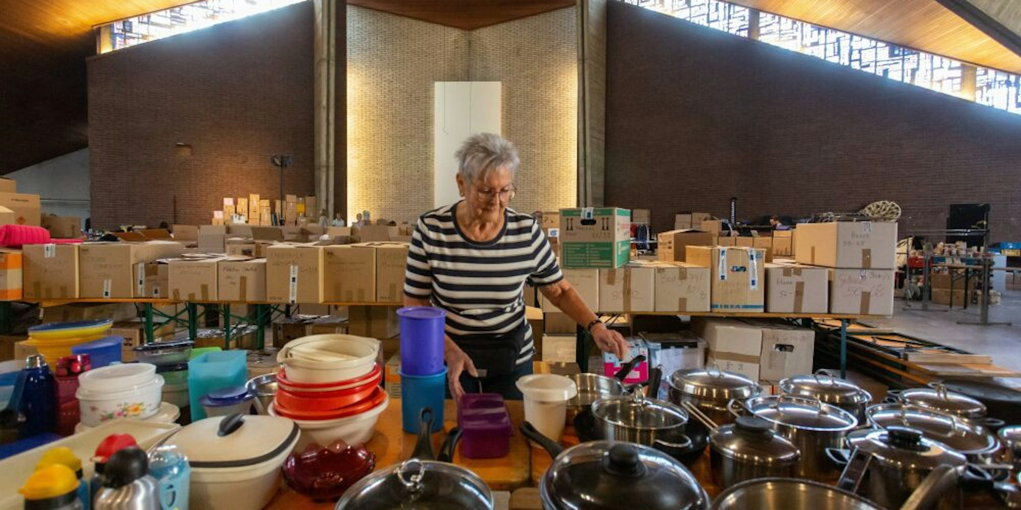 Zahlreiche Spenden stapeln in der Rheinbacher Pallottikirche. Sieglinde Botz vom Team des Hilfszentrums sortiert die Küchenutensilien.