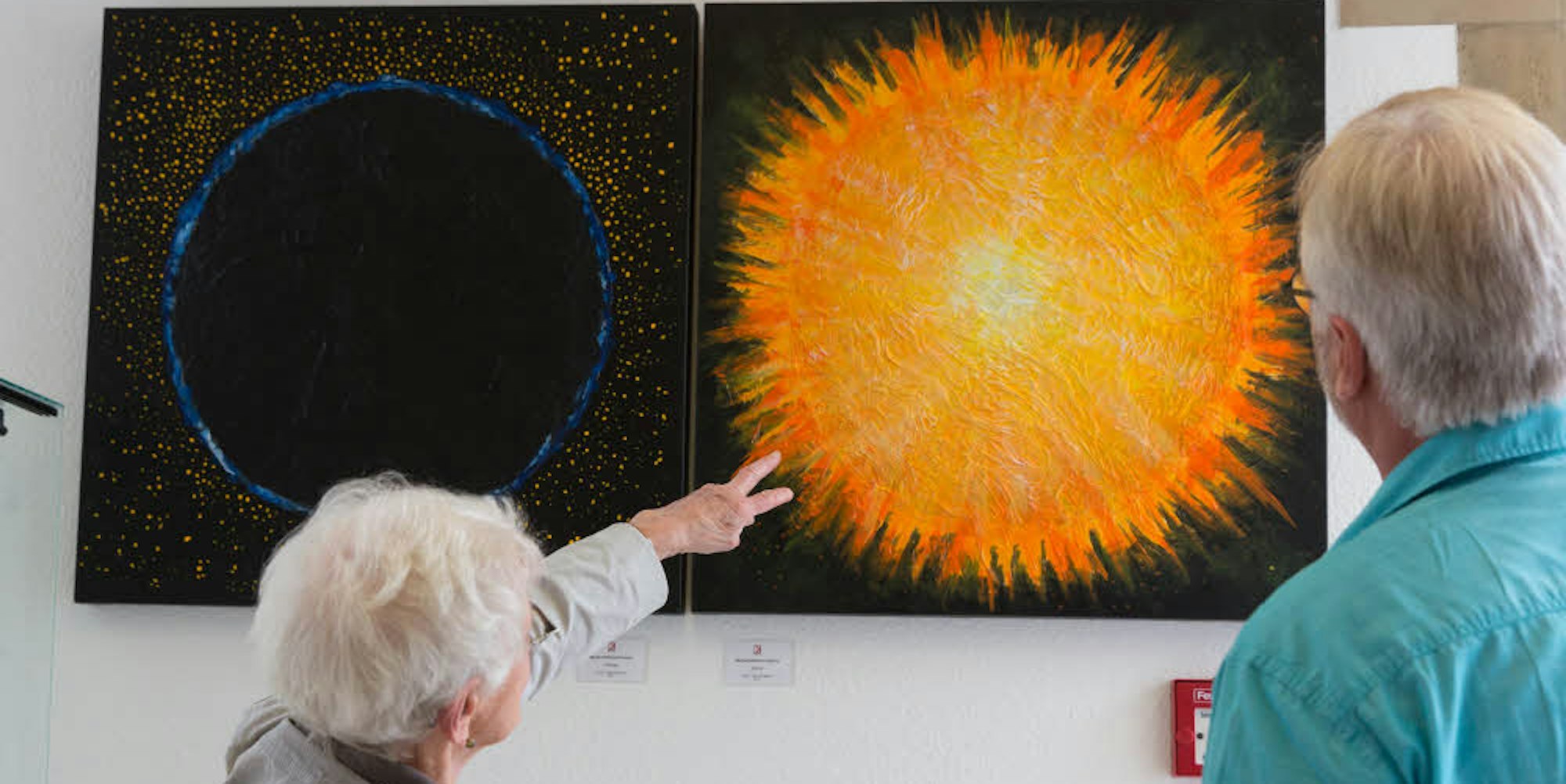 Auch bei Marita Dymny gehen Farbe und Material eine ästhetische Verbindung ein: Werke wie die strahlende Sonnenscheibe verdeutlichen dies. Mariola Hornung spielt im Portrait einer Dame mit Kontrasten. Der von links kommende Lichteinfall verändert die Gesichtsfarbe vom warmen Orange zum im Schatten liegenden kühlen Blau. Udo Heyder zeigt Bilder, die zunächst fern der Abstraktion und oftmals eine heitere, farbenfrohe Stimmung auszudrücken scheinen. Die fröhlichen, in länderfarben gezeichneten Shirts oder Trikots, die lustig am blauen Himmel herumflattern, umkreisen tatsächlich den Wolkenpilz einer Atomexplosion. Karin von Ostholt-Haas zeigt in Doppelportraits Nähe und Verletzlichkeit. Kontrastreiche Akzentuierung von Licht und Schatten und der Einsatz von Schlaglichtern verstärken die Wirkung. Pascale Jansen zeigt mit ihren Fotografien und Verfremdungen, welche Bandbreite der Kunst zur Verfügung steht. Ihr Bild einer fast wüstenartigen Steinlandschaft im portugiesischen Figueira da Foz rückt den Schatten in den Vordergrund und macht ihn zum eigentlichen Motiv. (r.)