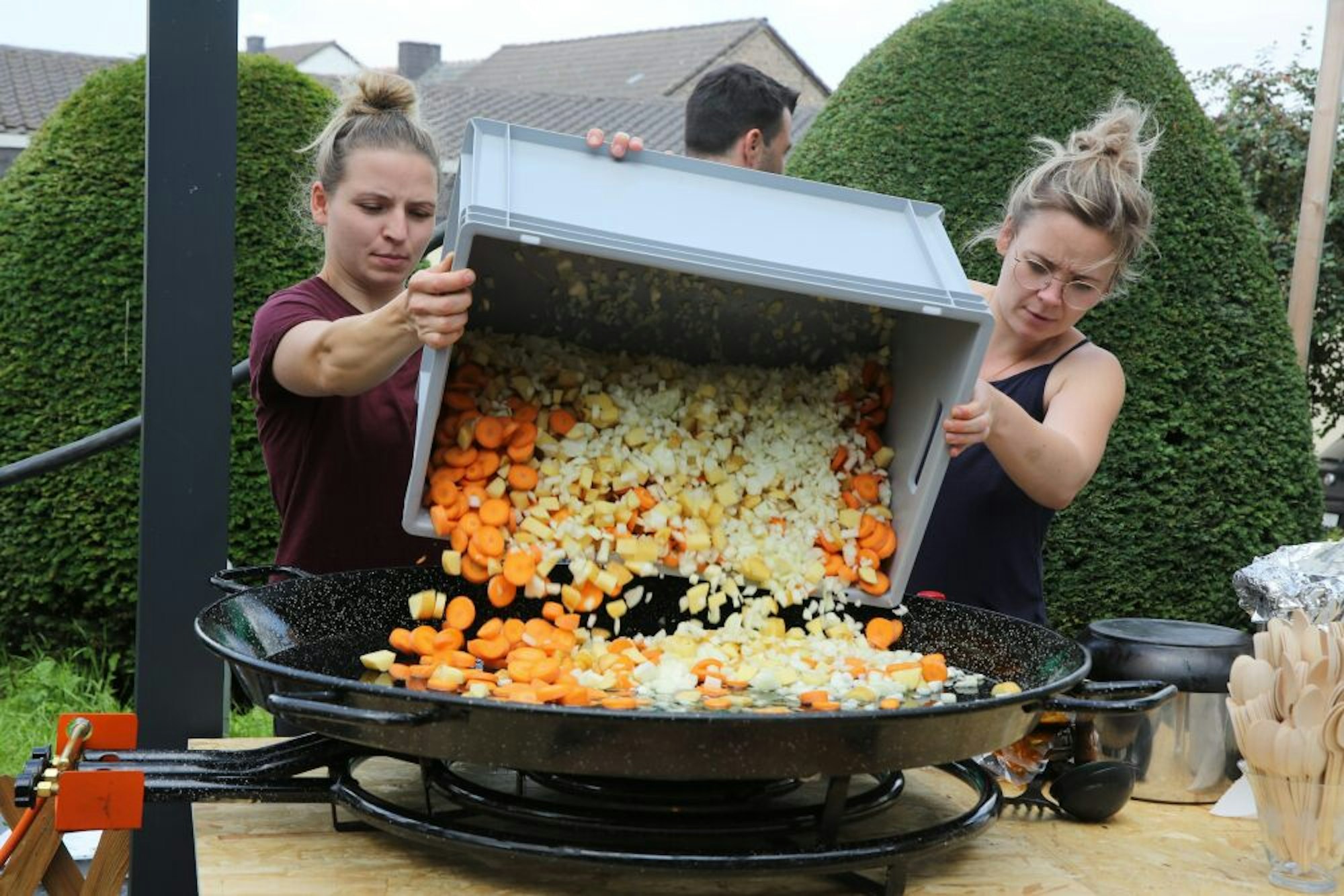 Längst ist Mittag, und die ersten Menschen sind wieder in der Ludwig-Fett-Halle, wo auf Tischen sortierte Hilfsgüter – Kleidung, Babynahrung, Hundefutter, Decken – ausgebreitet sind, warme Speisespenden verteilt werden und die Duschen warmes Wasser haben. „Das alles ist von privater Initiative ausgelöst worden“, erklärt ein Nachbar. Ein Helferin sagt: „Es war die Initiative von mehreren Parteien, die im Internet sofort Helfer aus vielen Gruppen gefunden hat.“ So sind auch die Geografiemasterstudentin Lisa Marie Pyka (27) und die arbeitsuchende ehemalige Tagesmutter Charlotte Olbeter (30) aus Köln nach Oberdrees gekommen. „Hinter uns steht das Kollektiv ,Kulturbüdchen‘. Wir kommen jeden zweiten Tag mit dem, was wir von den Spenden, die wir gesammelt haben, einkaufen konnten.“ Die Riesenpfanne mit Gasbetrieb hat ihnen der Wirt des Kult-Lokals „Bagatelle“ in der Kölner Südstadt geliehen.