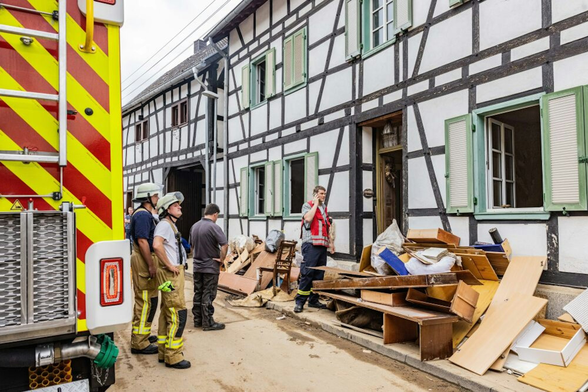 Ein paar Häuser weiter links wird Inventar durch das Kellerfenster gereicht. Waschmaschine, Drucker, Schränke, Bürostuhl. Alles für den Schuttberg vor Rheinbach. Ein Anlieger fährt mit einem Anhänger in seinen Hof. Aus Bottichen schwappt Wasser. Der Fahrer sagt:„In allen Zimmern steht der Schlamm. Ich habe nicht mal mehr eine saubere Unterhose.“ Dann beginnt er, auf dem Anhänger die Wäsche zu waschen, die er aus dem Schlamm gezogen hat. „Es gibt Leute, die sind schlimmer dran.“ Das ist an diesem Tag der Satz, mit dem sich viele trösten. Immer wieder wird auf das Schicksal der Menschen an der Ahr verwiesen. „Ja, ich habe die Dinge meines Großvaters verloren, der einmal Sattler war, und die schon fünfmal mit umgezogen waren. Aber wir leben noch und haben unsere Wohnung“, sagt eine Frau aus der Nachbarschaft. Auch ihr sei das Wasser bloß in den Keller geschwappt, weil die Lastwagen durchs Wasser fuhren.
