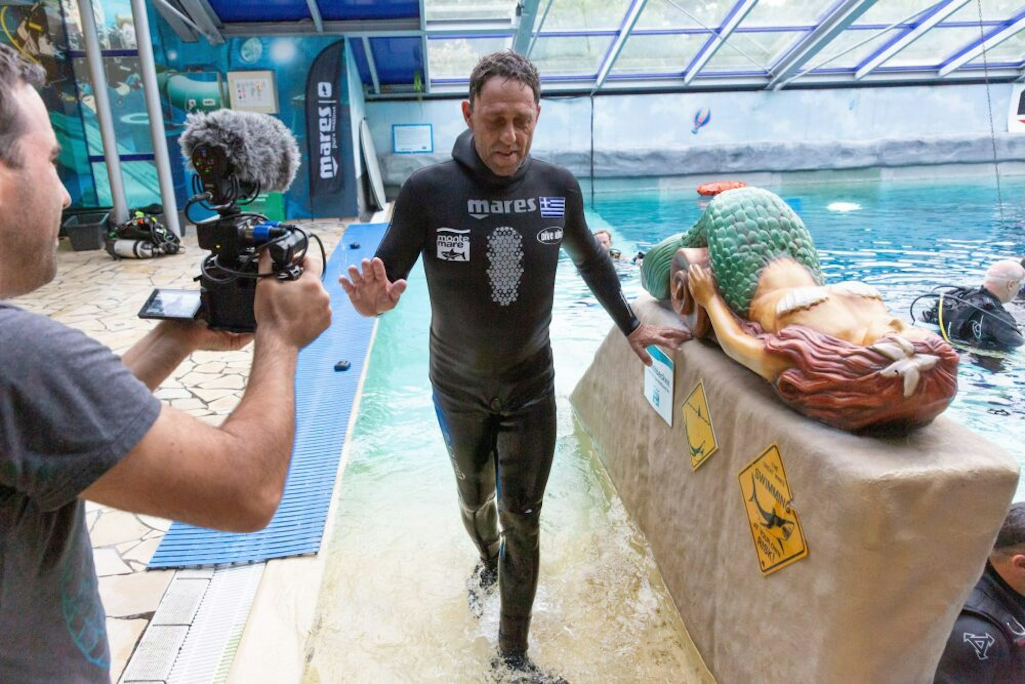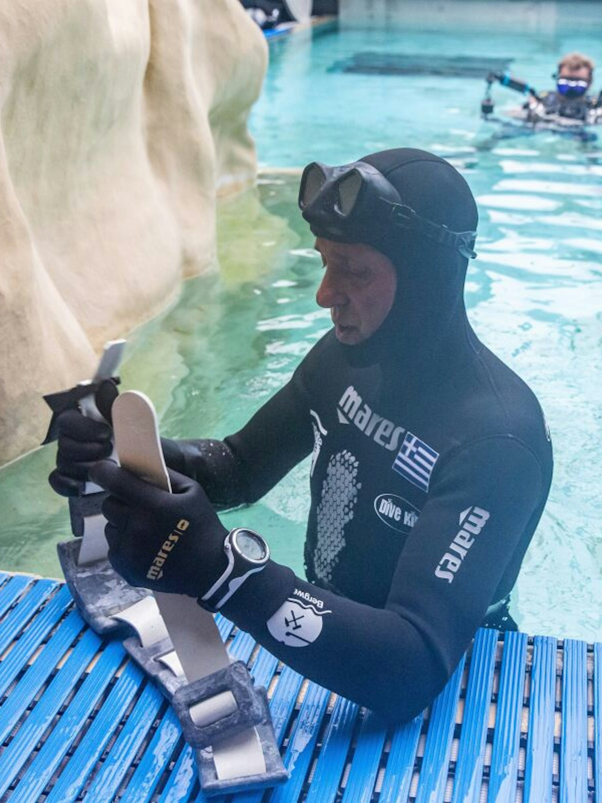 Für seinen Rekord ließ sich der Mann langsam an einer Sicherungsschnur in das Becken hinab. Ganz so, wie die Apnoe-Taucher in seiner Heimat. Allerdings nicht bloß mit einer Badehose bekleidet, sondern einer kompletten Tauchmontur, also mit Anzug, Handschuhen, Flossen und Maske.