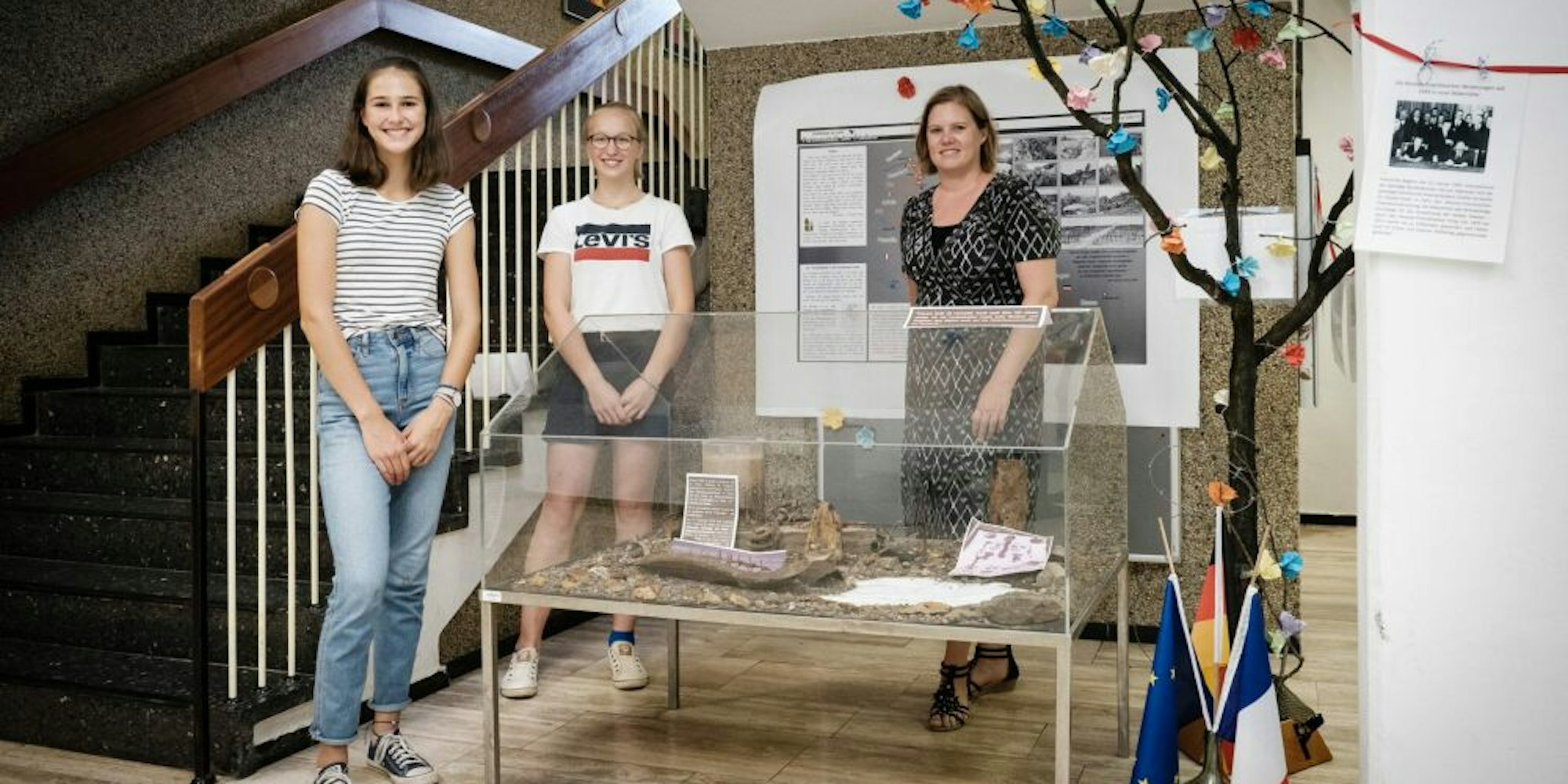 Im Städtischen Gymnasium Rheinbach ist derzeit die Ausstellung zu sehen, die nach der Unterzeichnung der Partnerschaft des Friedens aufgebaut worden ist. Paula Dörflinger, Friedericke Krancke und Lehrerin Stephanie Ewald (von links) waren Teil der Delegation.