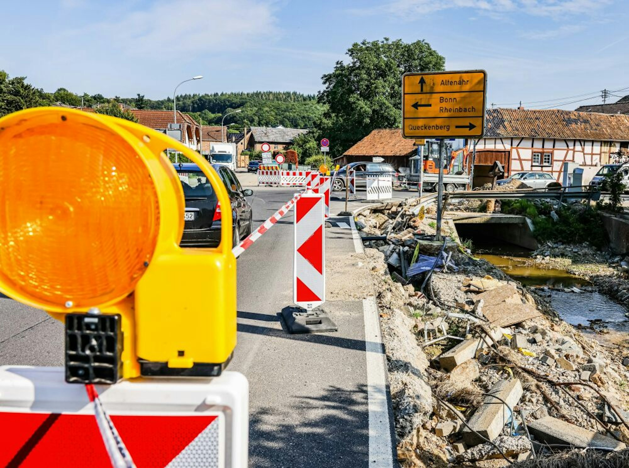 Rheinbach – Auf den ersten Blick sieht es im kleinen Ort Loch so aus, als wäre die Flutkatastrophe erst wenige Tage her. Haufenweise lagern Trümmer und weggespülte Backsteine neben den Häusern. Die Abbruchkante der Landstraße wirkt unberührt. Direkt daneben liegen Leitungen, teilweise verrostet oder abgerissen, ebenso Abflussrohre oder abgeknickte Straßenschilder. Die Leitplanke würde nicht einmal mehr Fußgänger vor einem Sturz in den Schiefelsbach bewahren. Frank Lamberty wohnt unmittelbar an dem eigentlich kleinen Flüsschen, das sieben Wochen nach dem Hochwasser wieder einem Rinnsal gleicht. Er kann darüber nur schmunzeln: „Es sieht doch schon wieder recht aufgeräumt aus.“
