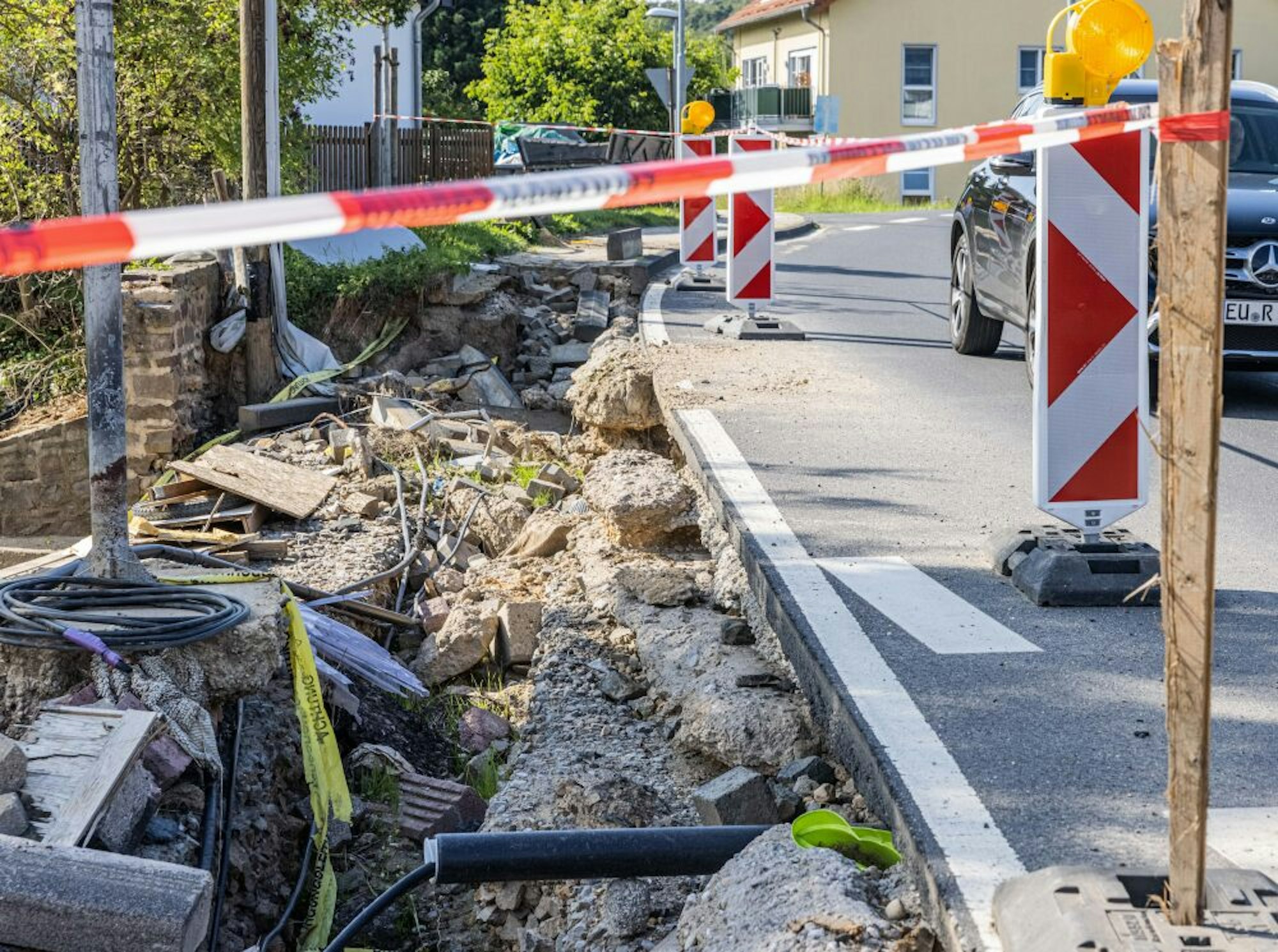 Anschließend sei vor lauter Matsch keine Straße, kein Bach und keine Wiese mehr zu sehen gewesen, so der Locher. Dementsprechend sähe es nun schon wieder ganz gut aus: Bagger und Lastwagen können die Straße wieder befahren, sie manövrieren um die zahlreichen Baucontainer herum, die auf der Fahrbahn stehen. Viele Anwohner räumen aus, die meisten holen noch den Estrich aus den Kellern.