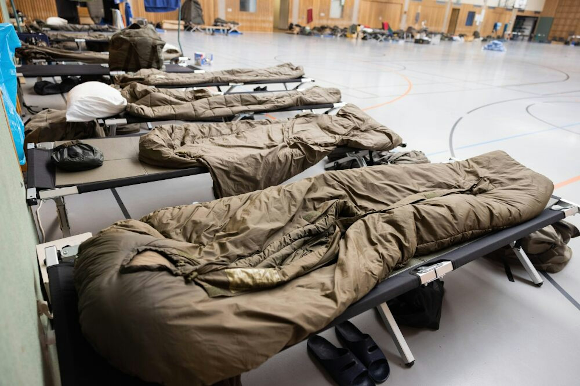 Ihre Feldbetten haben Soldaten aus Minden in einer Meckenheimer Turnhalle aufgebaut.