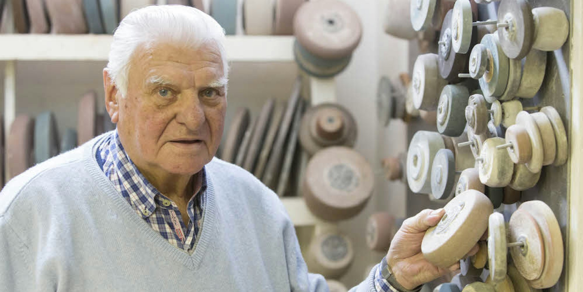 Seine Werkstatt überließ Fritz Berg dem Glasmuseum. Zu besonderen Gelegenheiten zeigte er Besuchern seine Kunst, so wie hier im Jahr 2014.