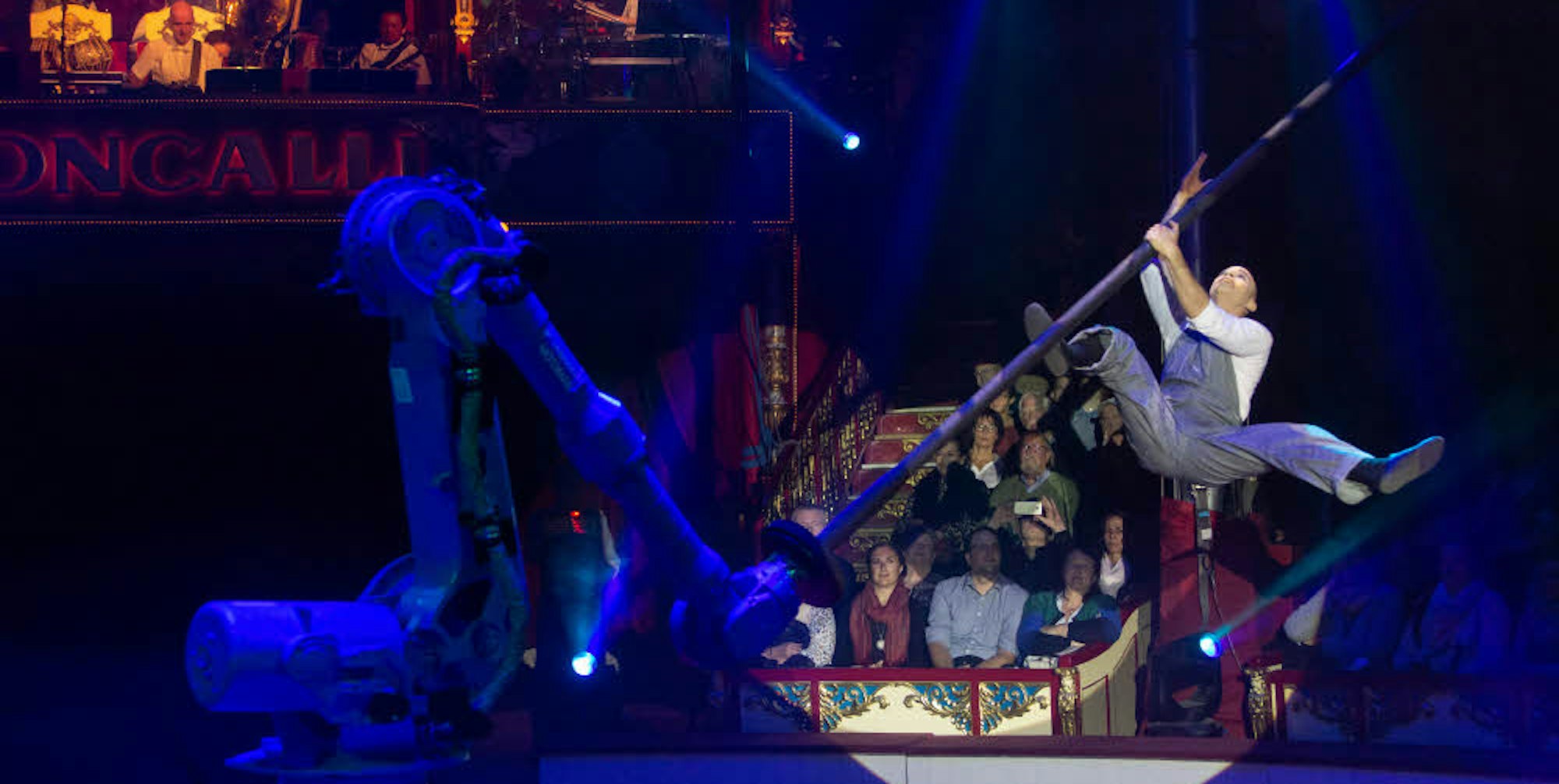 „RoboPole“ ist das genaue Gegenteil: Zirkus 2.0 mit einem Artisten und „Pauline“, einem fast drei Tonnen schweren Roboter aus der Automobilindustrie. Hier turnt der Gaukler nicht mehr unterm Trapez, sondern am Roboterarm. Sensationell!
