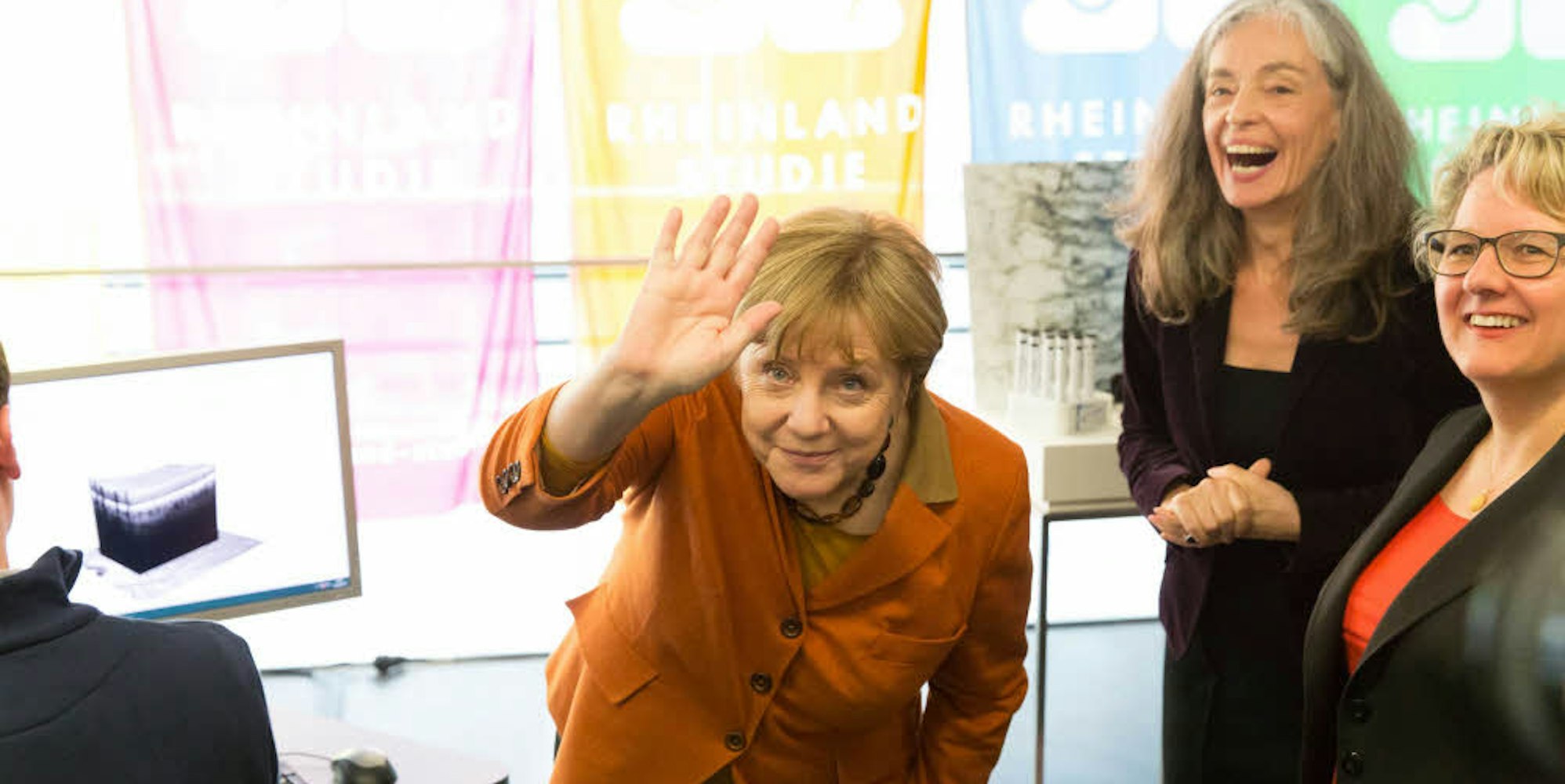 Freundliches Winken für die Fotografen: Angela Merkel, Monique Breteler und Svenja Schulze (oben v. l.) beim Rundgang durch den Neubau.