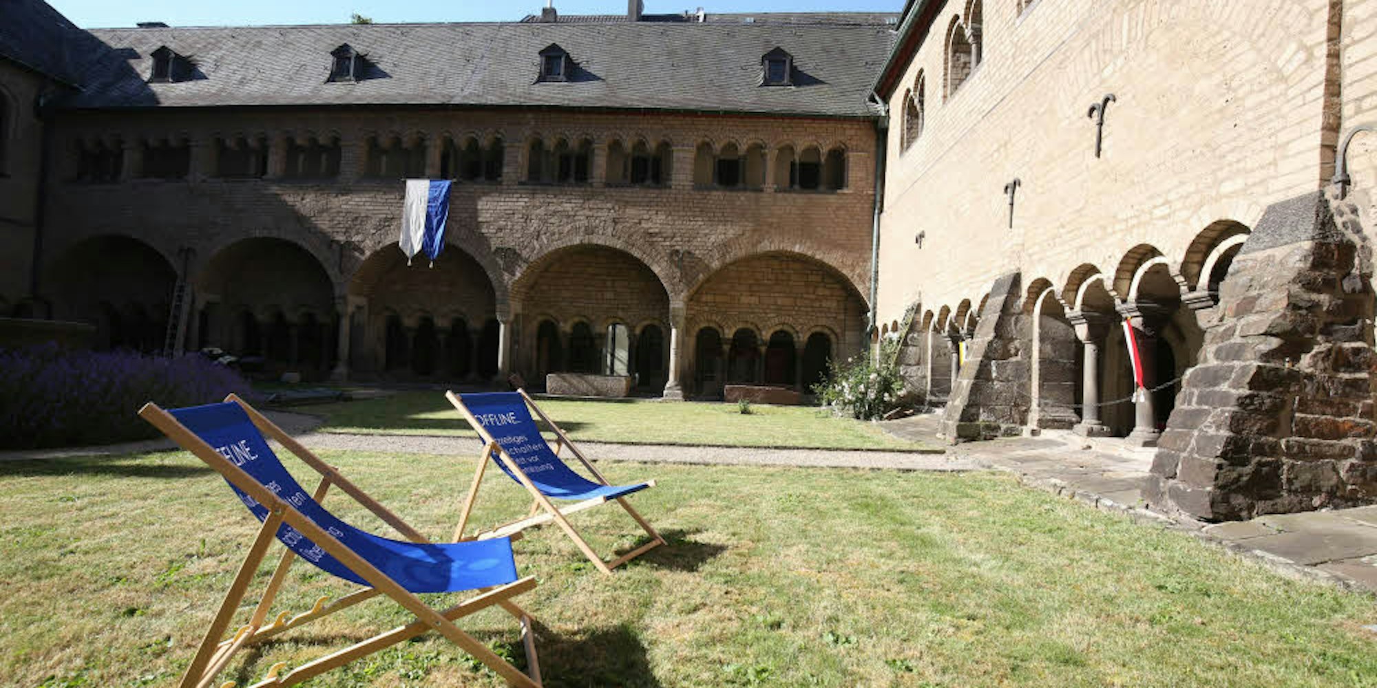 Bonn – „Offline – kurzzeitiges Abschalten schützt vor Überhitzung“ steht auf dem blauen Stoff der zwei Holzliegestühle, die auf der Rasenfläche des Kreuzgangs des Bonner Münsters stehen. Blühende Rosen ranken neben den rund 900 Jahre alten Säulen in die Höhe, in der Mitte des Platzes summen Bienen im lila leuchten Lavendel. Ansonsten ist es schön ruhig hier mitten in der quirligen Bonner City.