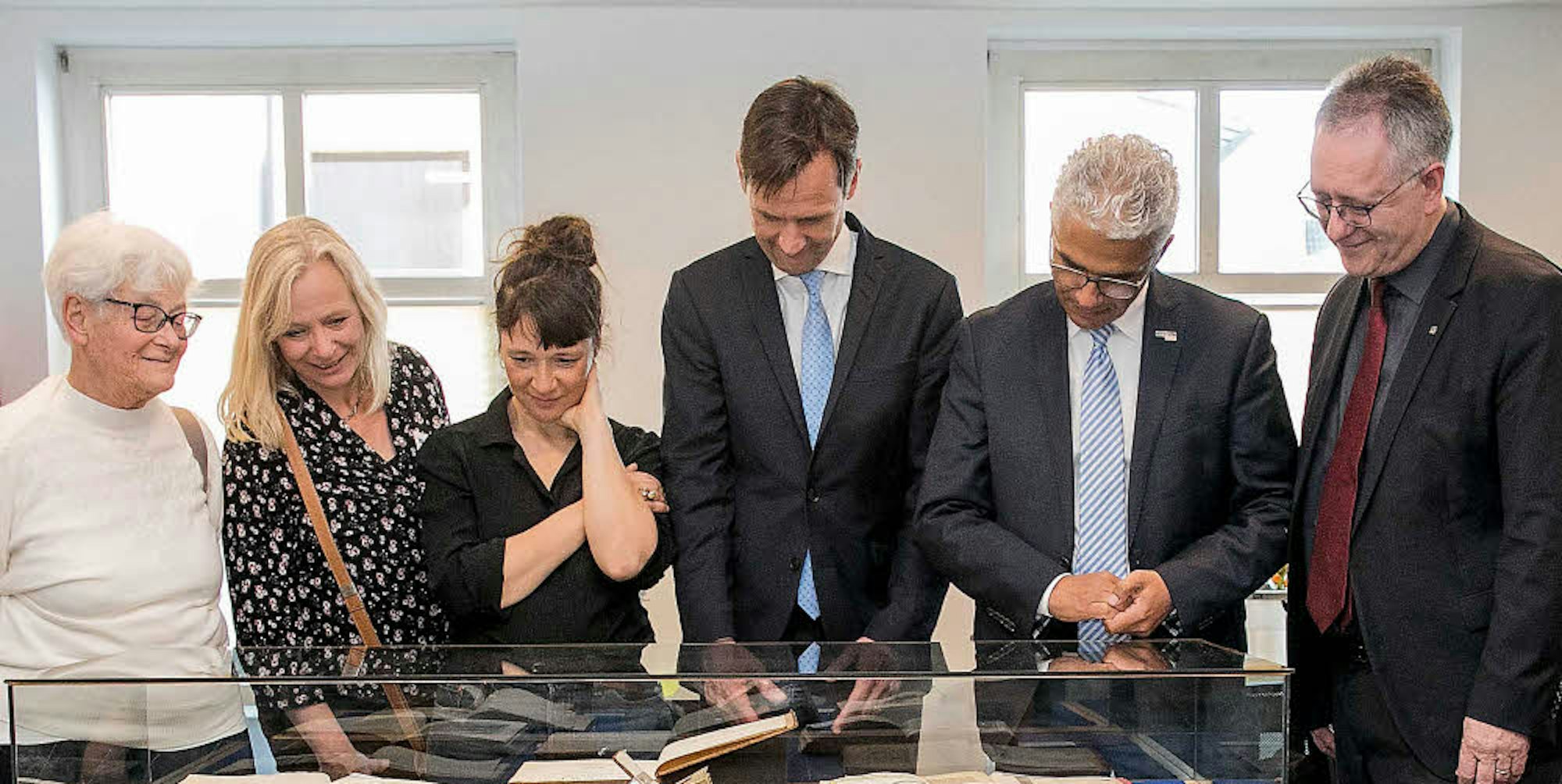 Die historischen Bücher schauten sich Tania Gregoire, Birgit Schaper (Abteilung Handschriften), Natascha Cadonici, Dr. Ulrich Meyer-Doerpinghaus, Ashok Shirdharan und Michael Hoch (v. l.) an.