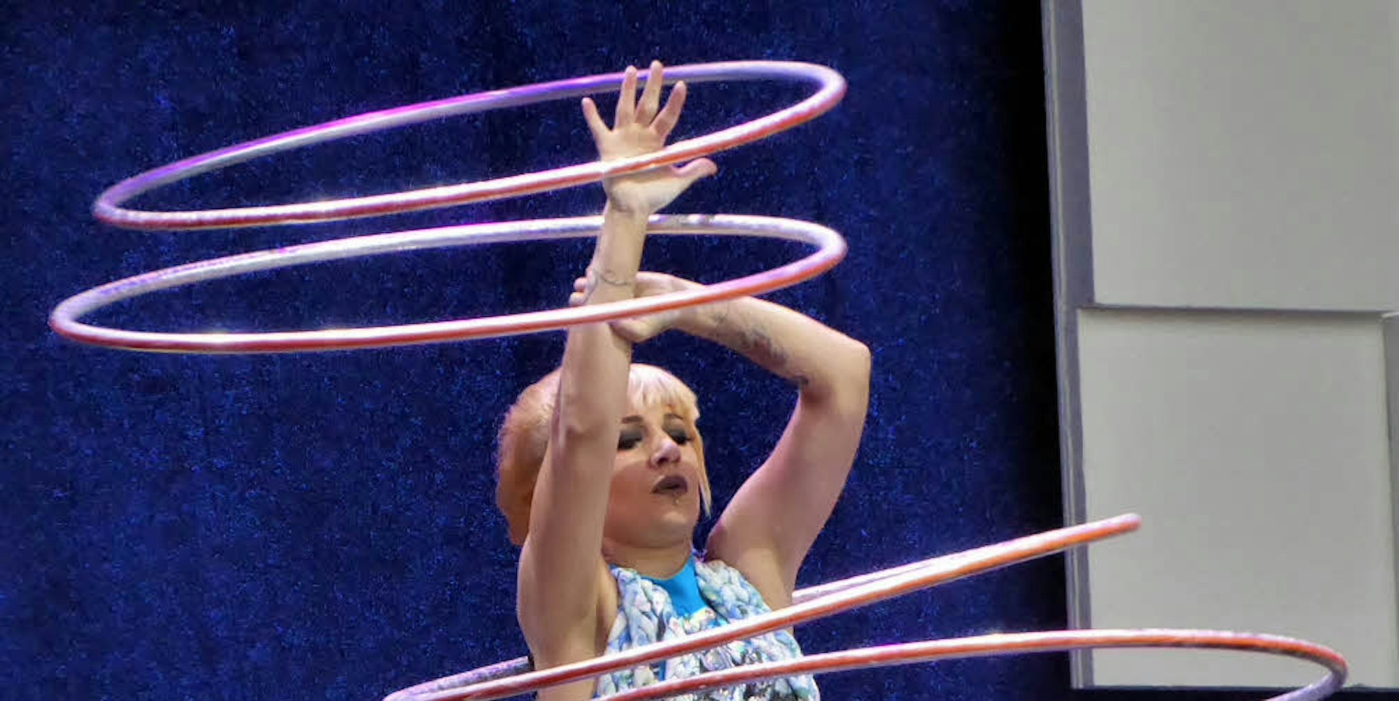 Varieté Open-Air: Daria Shcherbyna ließ ihre Hula-Hoop-Reifen mal turbulent am Körper oder an Armen und Beinen wirbeln, Ingrid Korpitsch vereinte an ihrem Luftring Kraft, Anmut und Artistik.