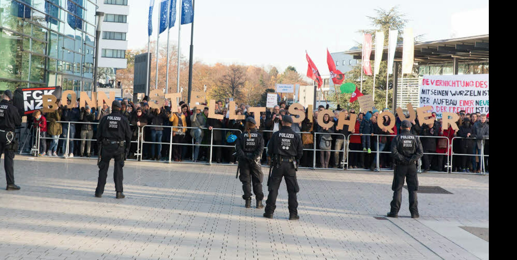 Bonn – Bunt, laut und friedlich haben gestern Nachmittag mehrere hundert Bonner vor dem Kongresszentrum WCCB gegen eine Gruppe der Identitären Bewegung demonstriert und sie mit Sprechchören wie „Nazis raus“ oder „Kein Mensch ist illegal, Bleiberecht überall“ übertönt. Die Bewegung hatte unter dem Motto „Stoppt den Migrationspakt“ zu einer Kundgebung gegen den geplanten Migrationspakt der Vereinten Nationen aufgerufen. Das Bündnis „Bonn stellt sich Quer“ (BSSQ) rief daraufhin zum Gegenprotest auf.
