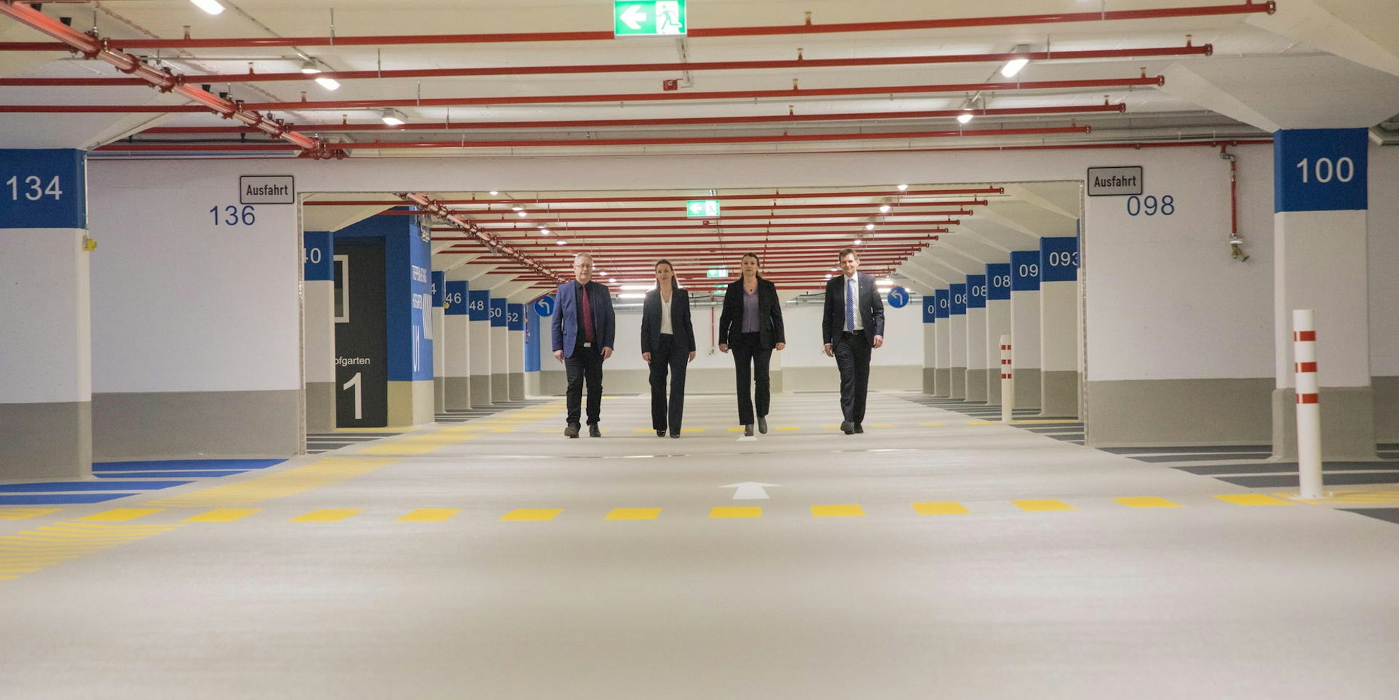 Hell, licht und farbig: (v..l.) Professor Michael Hoch (Uni-Rektor), Tamara Riedesser (City Parkraum GmbH), Christiane Feger (BLB-Projektleiterin) und Holger Gottschalk (Uni-Kanzler) in der von Grund auf sanierten Uni-Tiefgarage.
