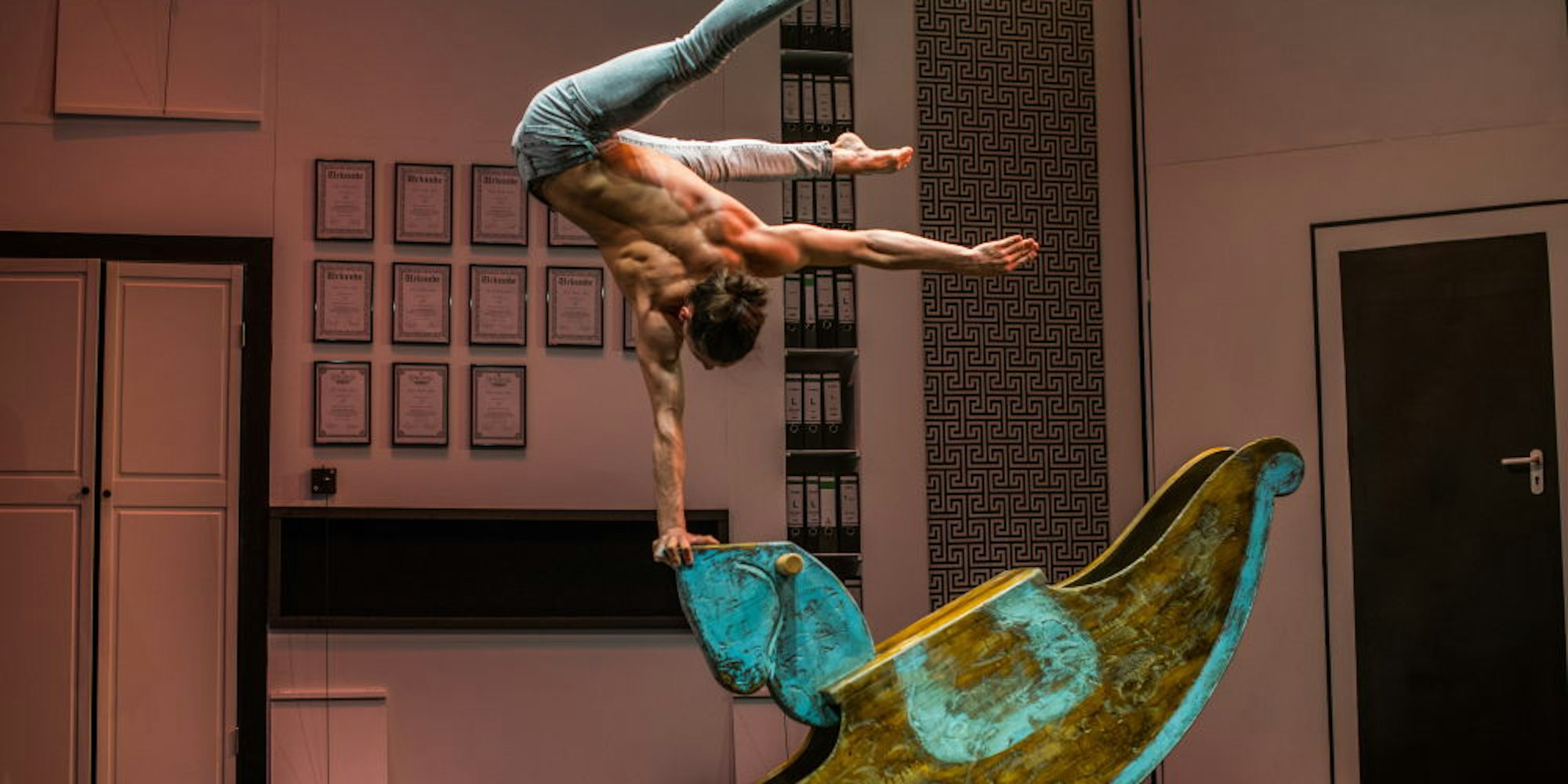 Auf einem alten Schaukelpferd zeigt Saleh Prinz Yazdani einen Handstand und weitere waghalsige artistische Einlagen.