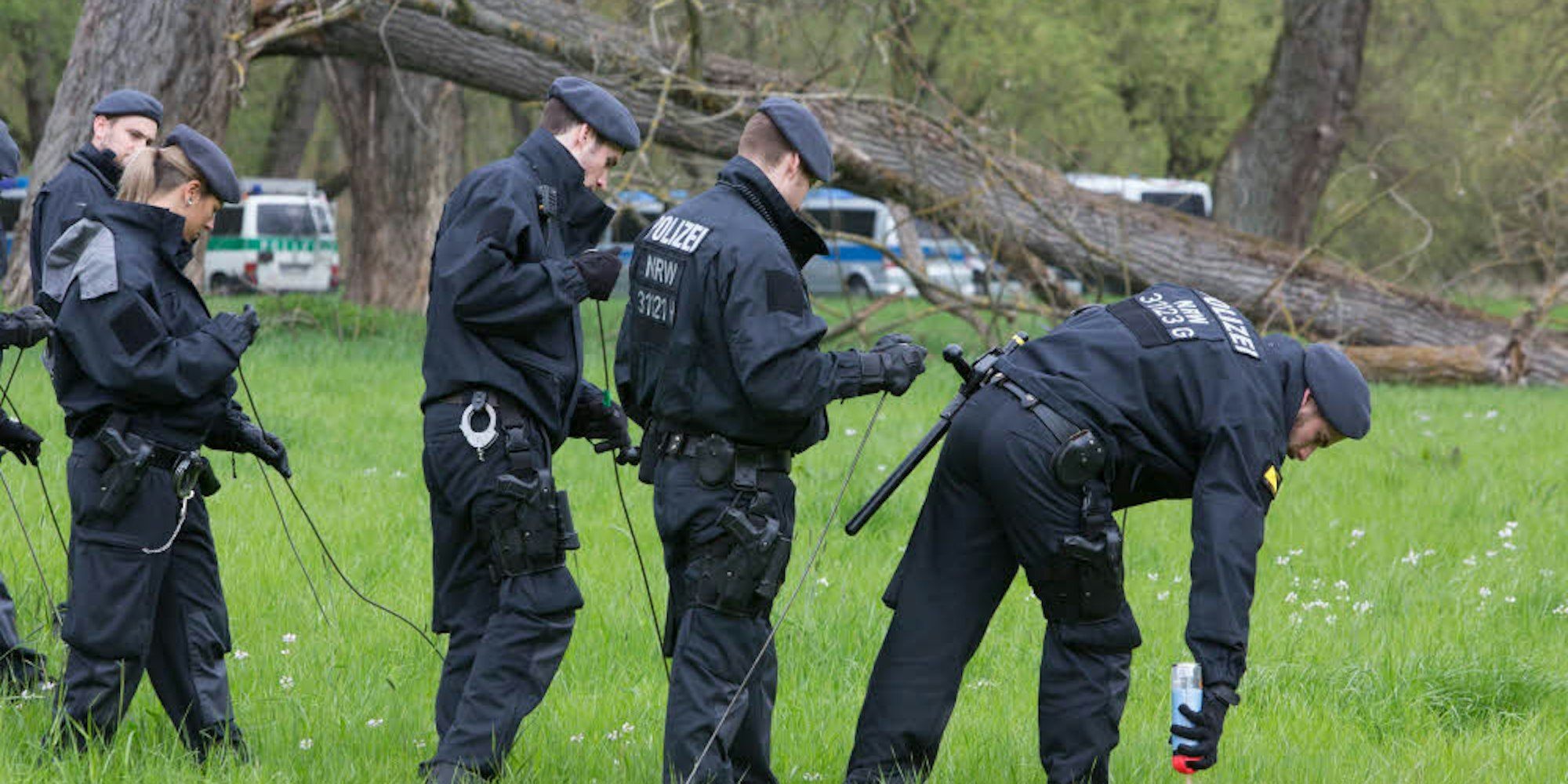 Polizisten einer Einsatzhundertschaft bei der Spurensuche in der Siegaue.