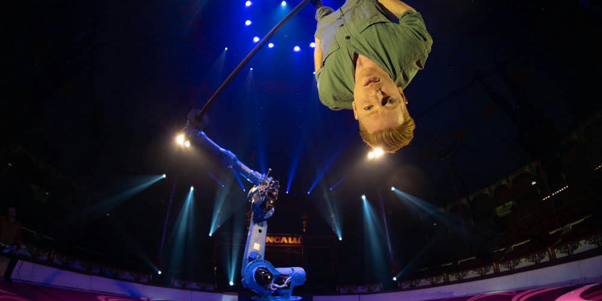 Ein Roboter ist der Untermann dieses Artisten, der hoch oben an einer Carbonstange turnt.