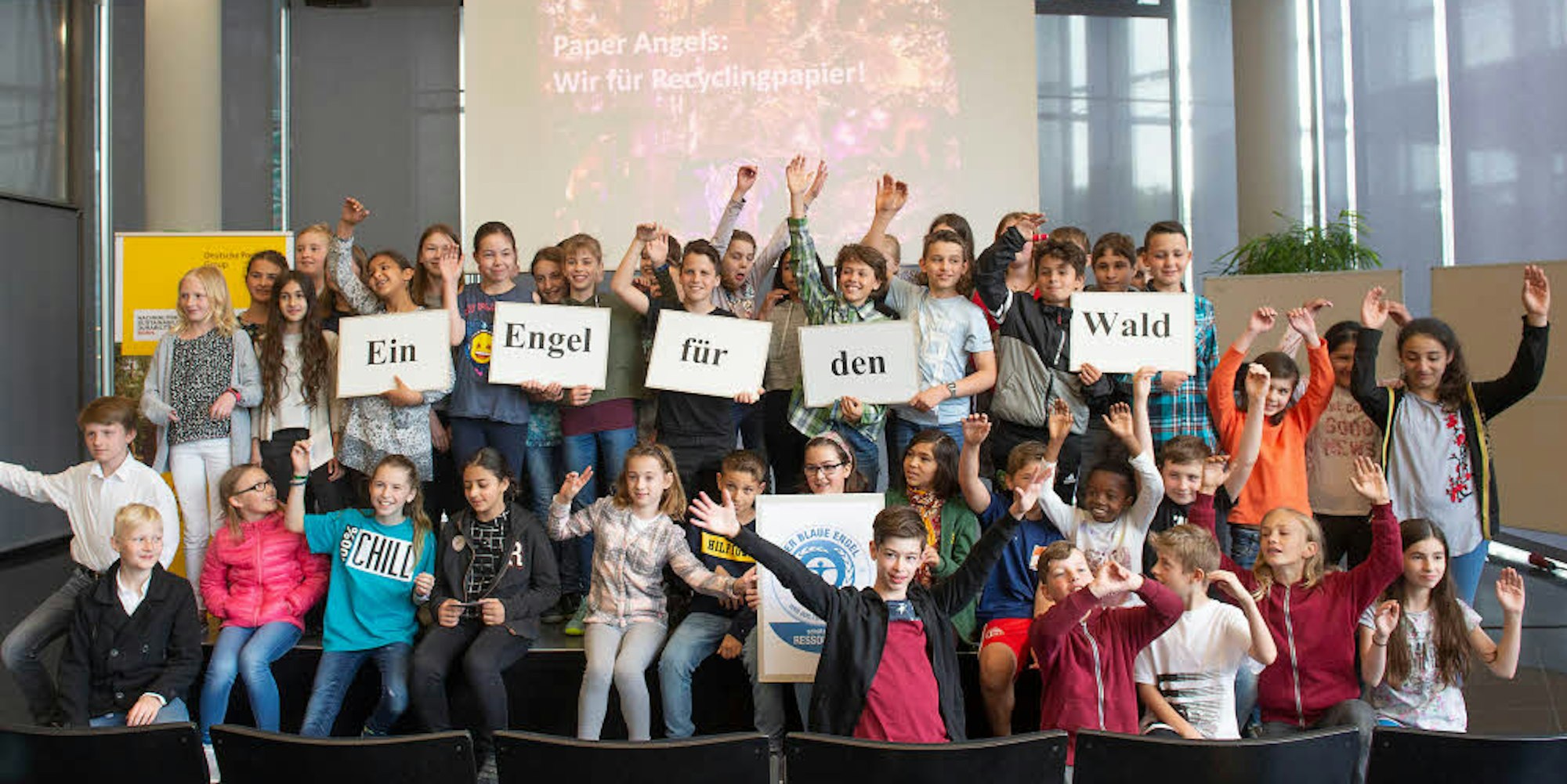 Bonn – Wie viel Papier verbrauchen wir? Wie wird Papier hergestellt, und wieso sollten wir Recyclingpapier benutzen? Diese Fragen haben sich die Schüler der Aktion „Paper Angels: Wir für Recyclingpapier“ gestellt, Informationen gesammelt und Antworten finden können. Sechs Bonner Schulklassen haben den Wettbewerb gewonnen und wurden jetzt im Post Tower mit Urkunden und Geldpreisen von je 150 Euro belohnt.
