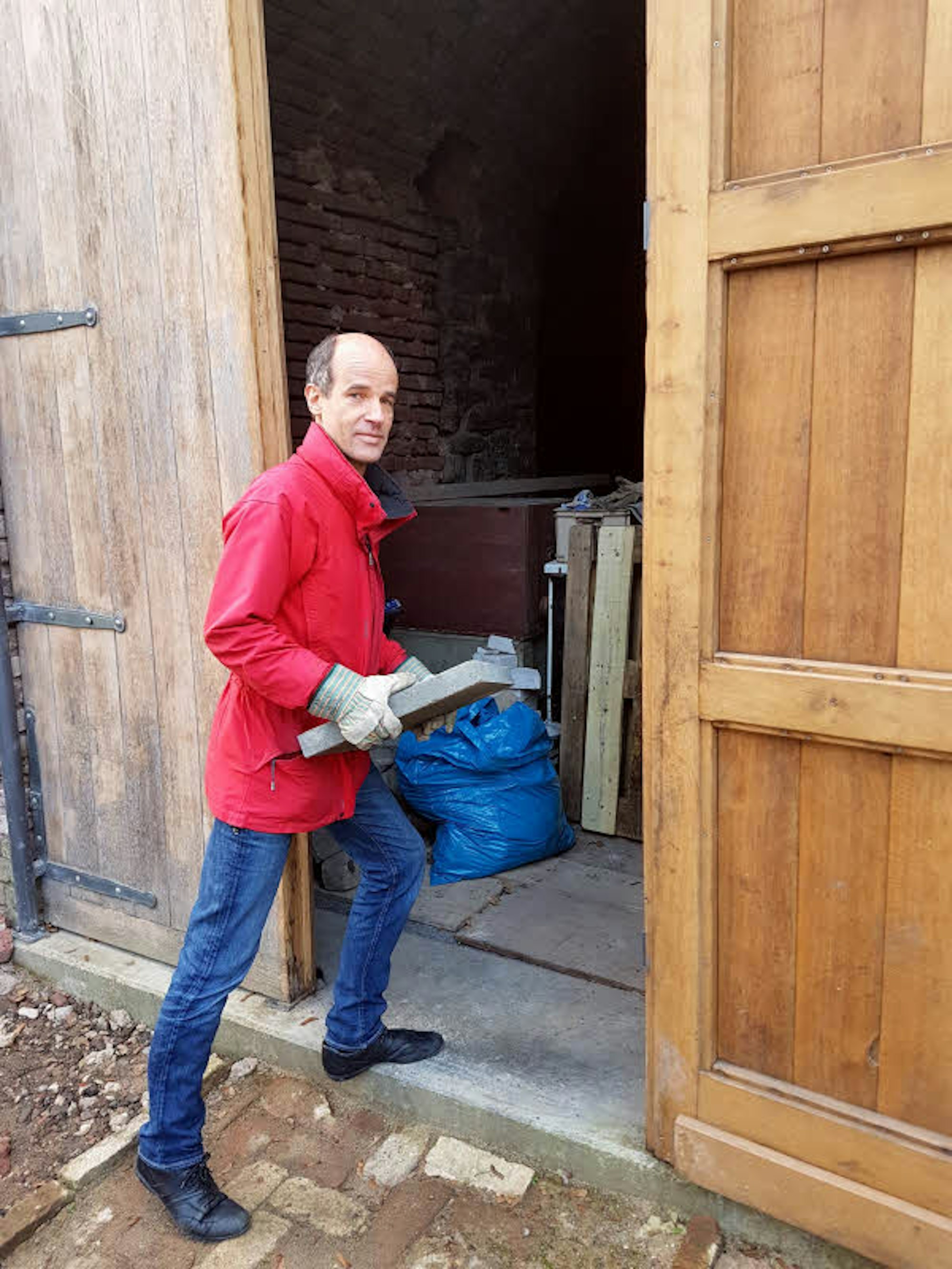 Stefan Rohrbach trägt eine Bodenplatte ins Haus.
