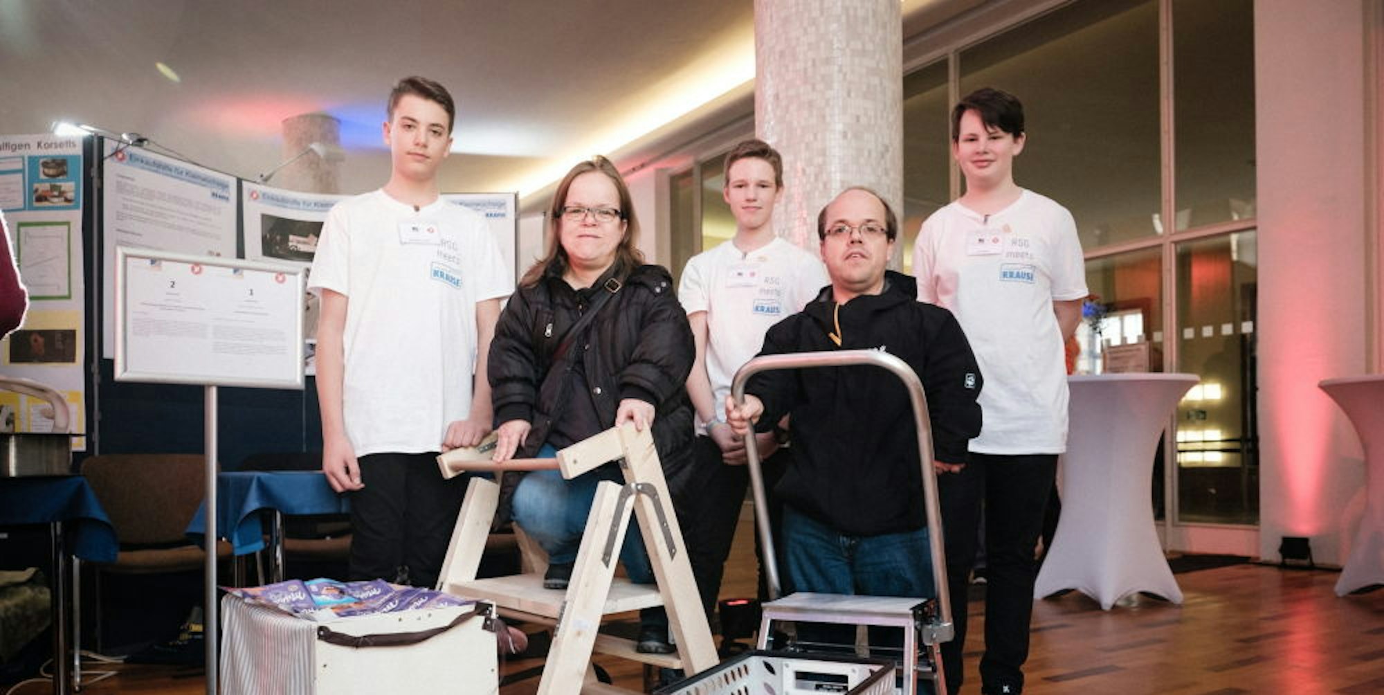 Felix Möller ist schon ein alter Hase. „Ich bin zum fünften Mal dabei – mit meinem sechsten Projekt“, verrät der 14-Jährige, der alle Umstehenden zum Lachen bringt, als er erklärt: „Meine Mutter beschreibt das schon als obsessiv.“ In diesem Jahr hat Felix seine Mitschüler Benjamin Scholer (14) und Jonas Mauelshagen (13) vom Rhein-Sieg-Gymnasium in Sankt Augustin dabei, die beide zum ersten Mal teilnehmen. Die Drei haben ein Interview mit dem Schauspieler Peter Dinklage aus der Serie „Games of Thrones“ gesehen und sind dabei auf ihre Idee gekommen. Der kleinwüchsige US-Amerikaner klagte über Probleme beim Einkaufen. „An die Sachen im obersten Regal dranzukommen oder in die großen Einkaufswagen zu greifen, ist für uns einfach nicht möglich“, erklärten Sandra und Mike vom Verband für kleinwüchsige Menschen, die gekommen waren, um die Drei zu unterstützen. Sie zeigten vor Ort, wie die Einkaufshilfe der drei Jungs sie unterstützen könnte, die aus einer kleinen Trittleiter besteht, die mit einem niedrigeren Einkaufskorb auf kleineren Rollen verbunden ist. „Dieser Prototyp ist klasse, er gibt uns Freiheit, weil wir damit selbstbestimmt einkaufen können“, lobt Mike.