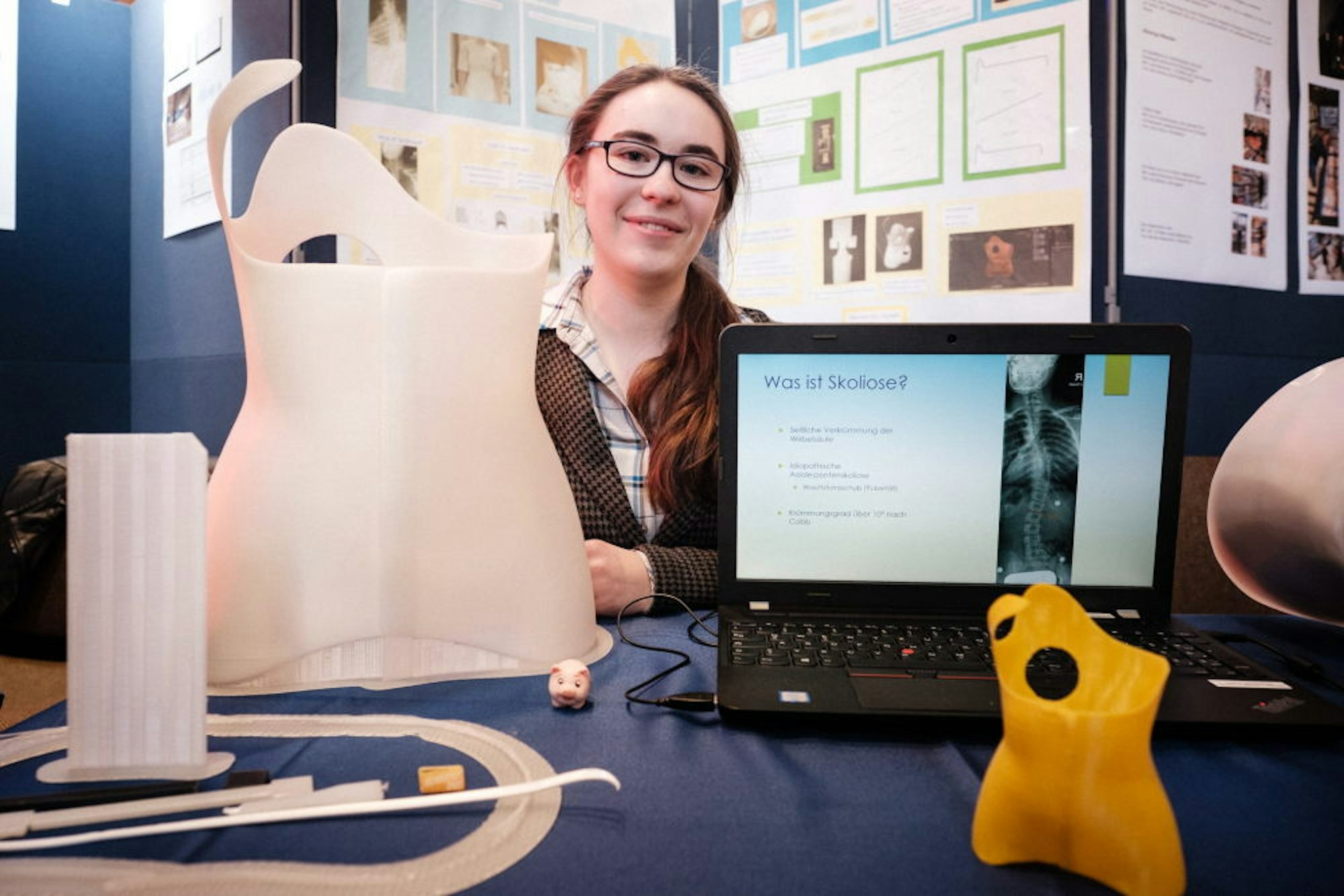 Direkt daneben sitzt Franziska Völzgen. Die Schülerin der Liebfrauenschule in Bonn hat ein Korsett entworfen, das bei der Erkrankung an Skoliose (Wirbelsäulenverkrümmung) helfen soll, aber deutlich nachhaltiger als die bisherigen Produkte auf dem Markt ist. „Ich bin mit 13 Jahren selbst an Skoliose erkrankt, und das Korsett hat mir viele Schmerzen genommen“, offenbart die 18-Jährige ihre Motivation hinter dem Projekt. Ihr Korsett ist aus PLA (Polylactat) statt aus dem üblichen PE (Polyethylen) hergestellt. „PLA wird aus nachwachsenden Rohstoffen wie zum Beispiel Mais hergestellt und ist biologisch abbaubar“, erklärt sie. „Mein Problem war nur: Darf man Essen bei so viel Hunger in der Welt für die Herstellung von Kunststoff benutzen? Aber es kann auch aus Essensabfällen hergestellt werden – davon gibt es auf der Welt definitiv genug.“ Ihr fertiges, lebensgroßes Modell hat sie in mehr als 77 Stunden Druckzeit im 3D-Drucker beim Verein Makerspace Bonn in Bad Godesberg angefertigt.