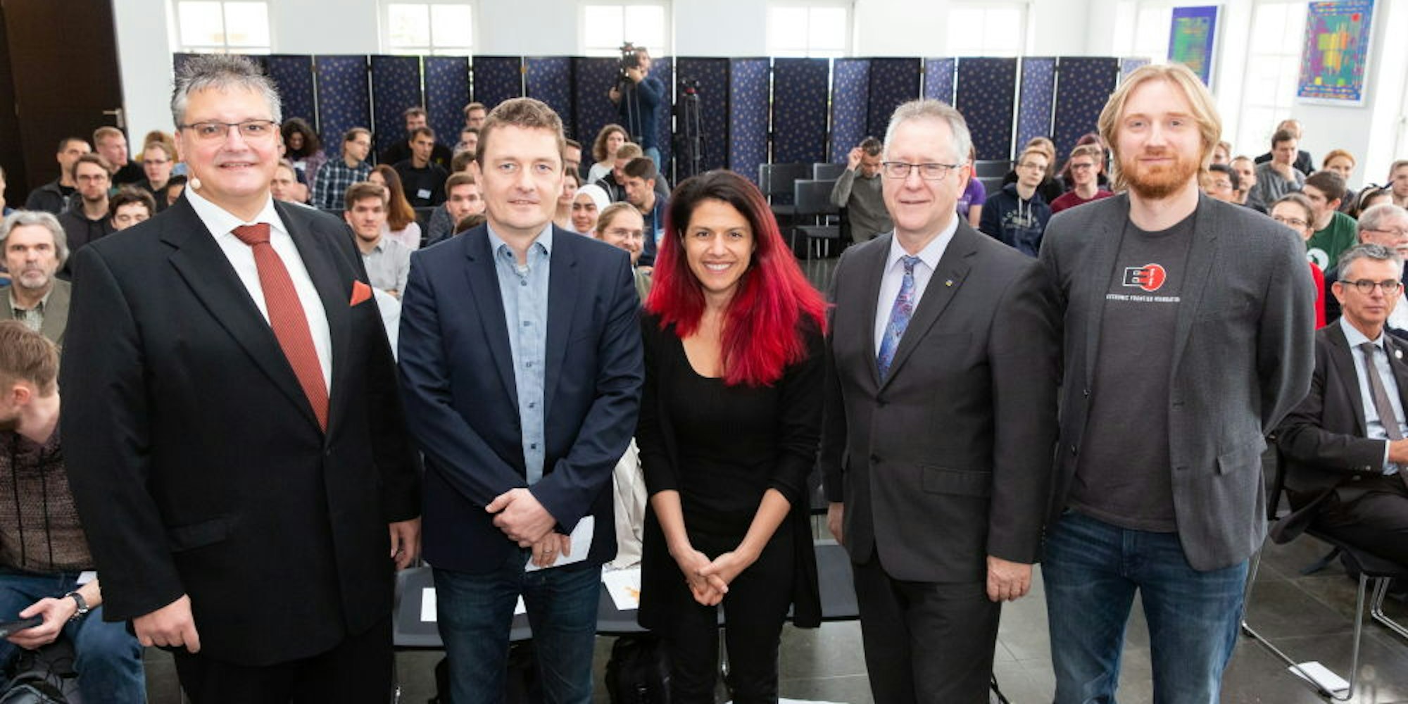 Den neuen Studiengang stellten (v.l.) Dirk Backofen, Michael Meier, Parisa Tabriz, Michael Hoch und Matthew Smith vor.