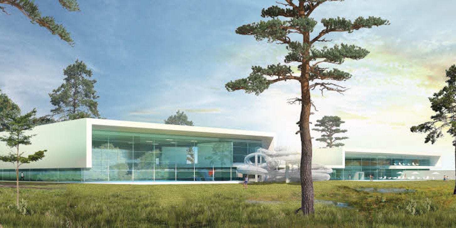 Könnte Realität werden oder auch nicht: der geplante Schwimmbadneubau in Bonns geografischer Mitte mit Rutsche vor den Gebäuden.