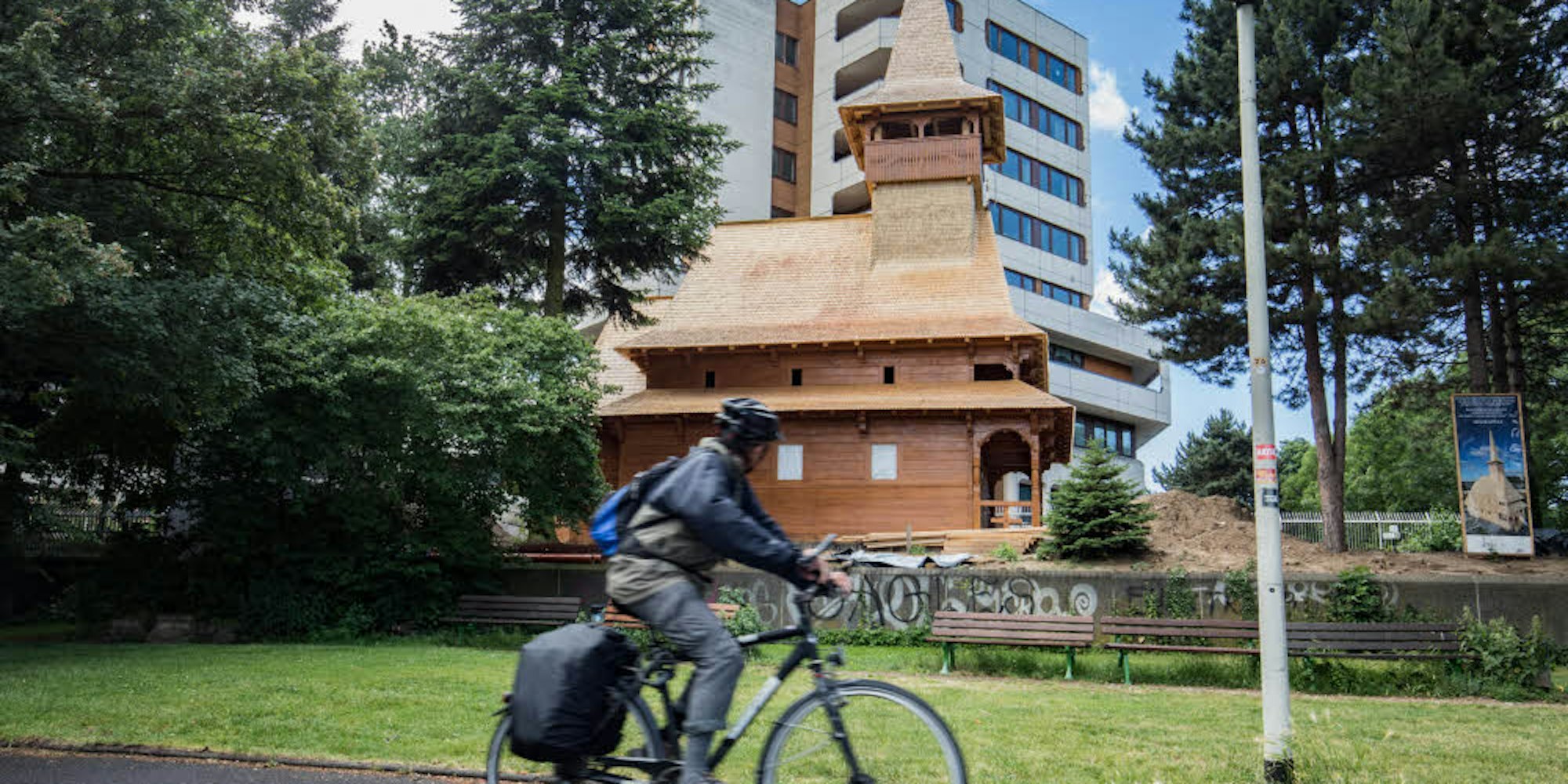 Ein Blickfang ist das Gotteshaus aus Holz, dass neben dem rumänischen Konsulat am Rheinufer steht.