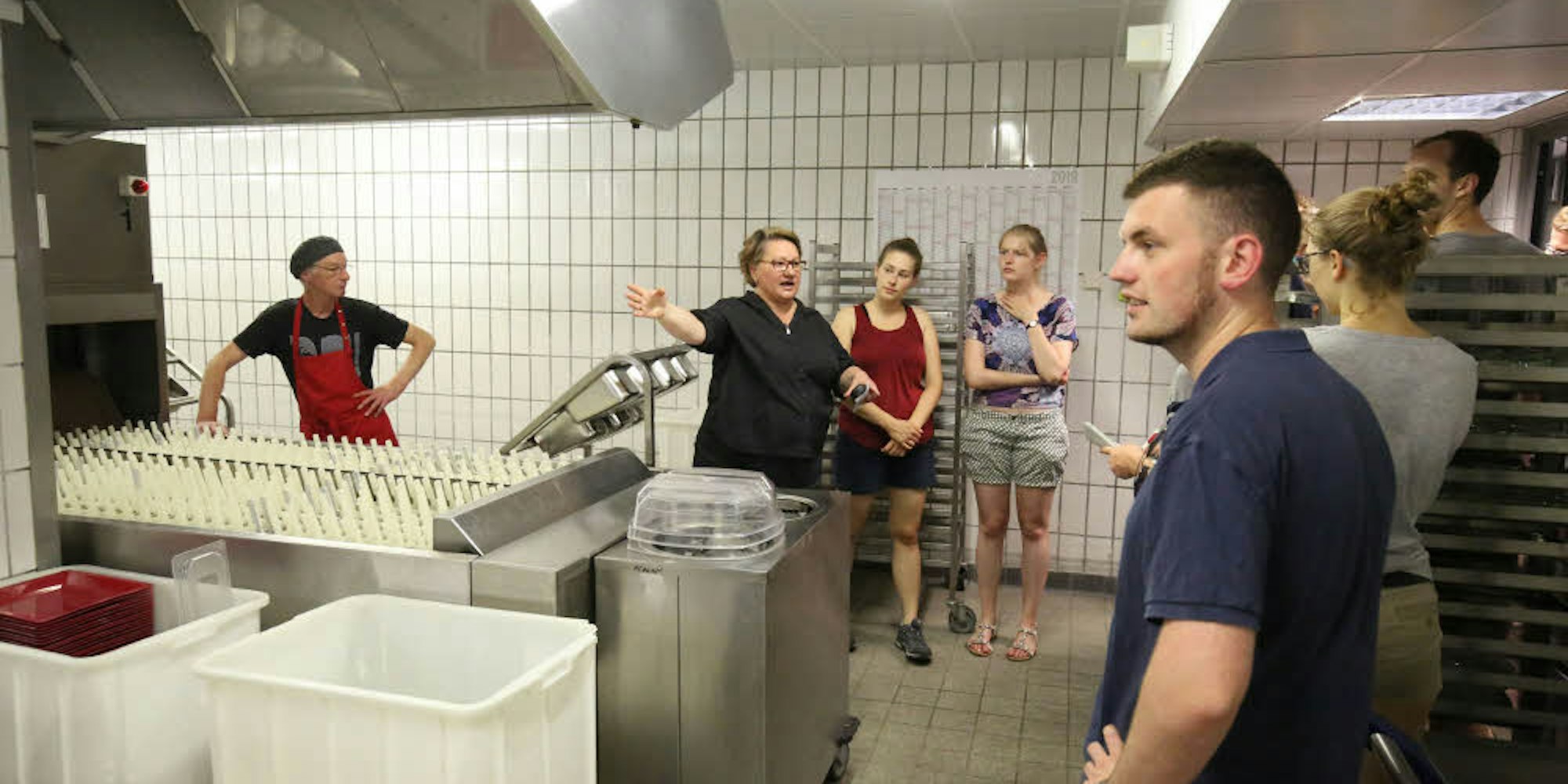 Betriebsleiterin Julia Schütza (2.v.l.) zeigte der Gruppe alle Bereiche der Mensa. Dazu gehörte auch ein Besuch in der Spülküche.