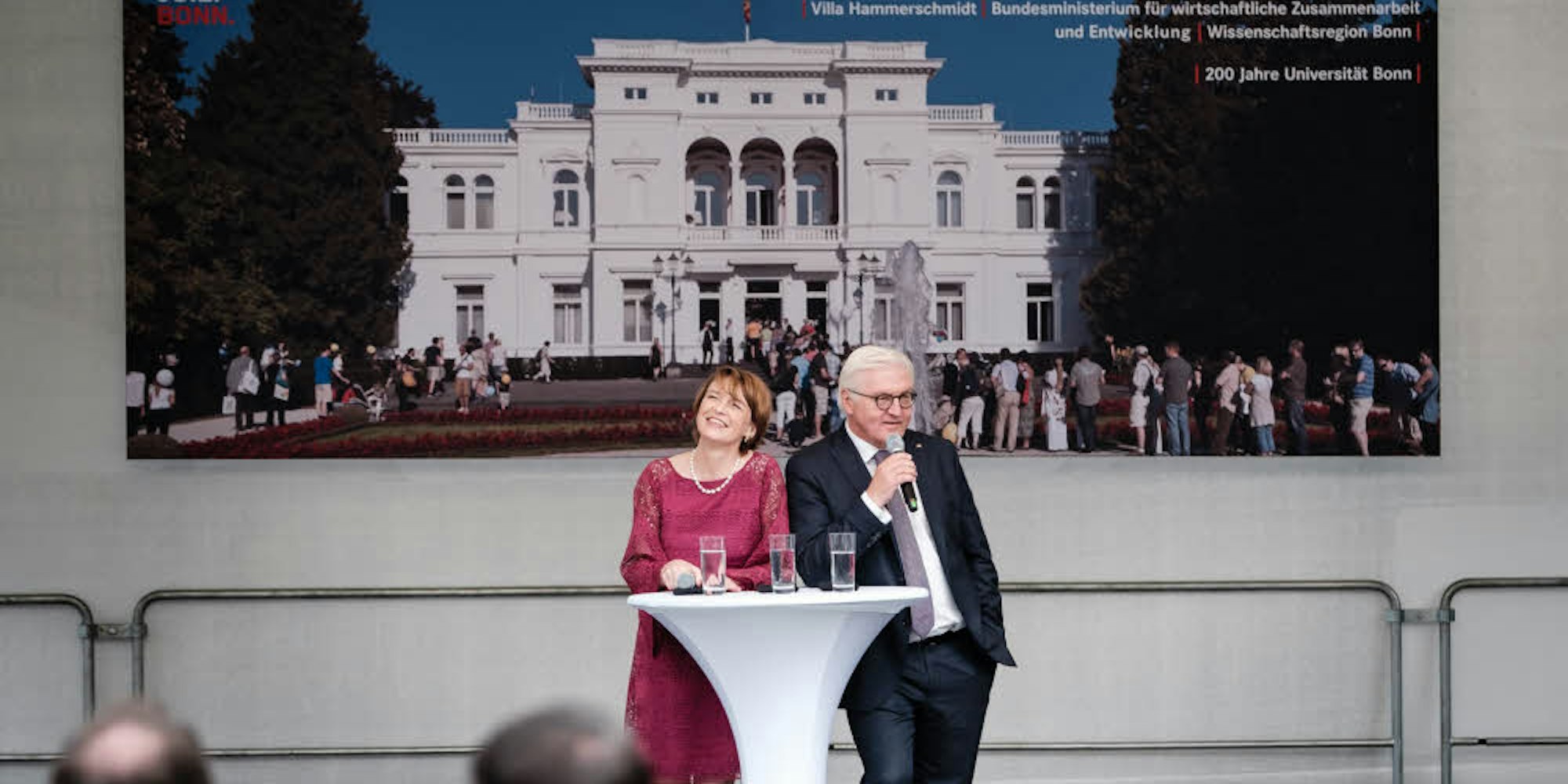 „Endlich mal wieder am Rhein, endlich mal wieder in Bonn“, sagte der Bundespräsident bei seiner Begrüßung. Seine Frau und er würden sich sehr freuen, wieder hier zu sein und Gespräche mit Gästen zu führen. Viele dieser Besucher seien womöglich zu Besuch in der Villa Hammerschmidt, um sich „an die goldenen Zeiten zu erinnern“, so Steinmeier. „Ich kann sehr gut verstehen, dass man sich gerne an die glücklichen Zeiten von damals, als Bonn noch Hauptstadt war, erinnert. Erinnern ist wichtig, denn hier wurden wichtige Grundsteine gelegt.“ Sowohl für die Freundschaft mit dem Westen als auch für die Entspannungspolitik gen Osten und die friedliche deutsche Einheit seien in Bonn die Voraussetzung geschaffen worden. „Das ist ein wichtiges Erbe, das nicht vergessen werden darf.“