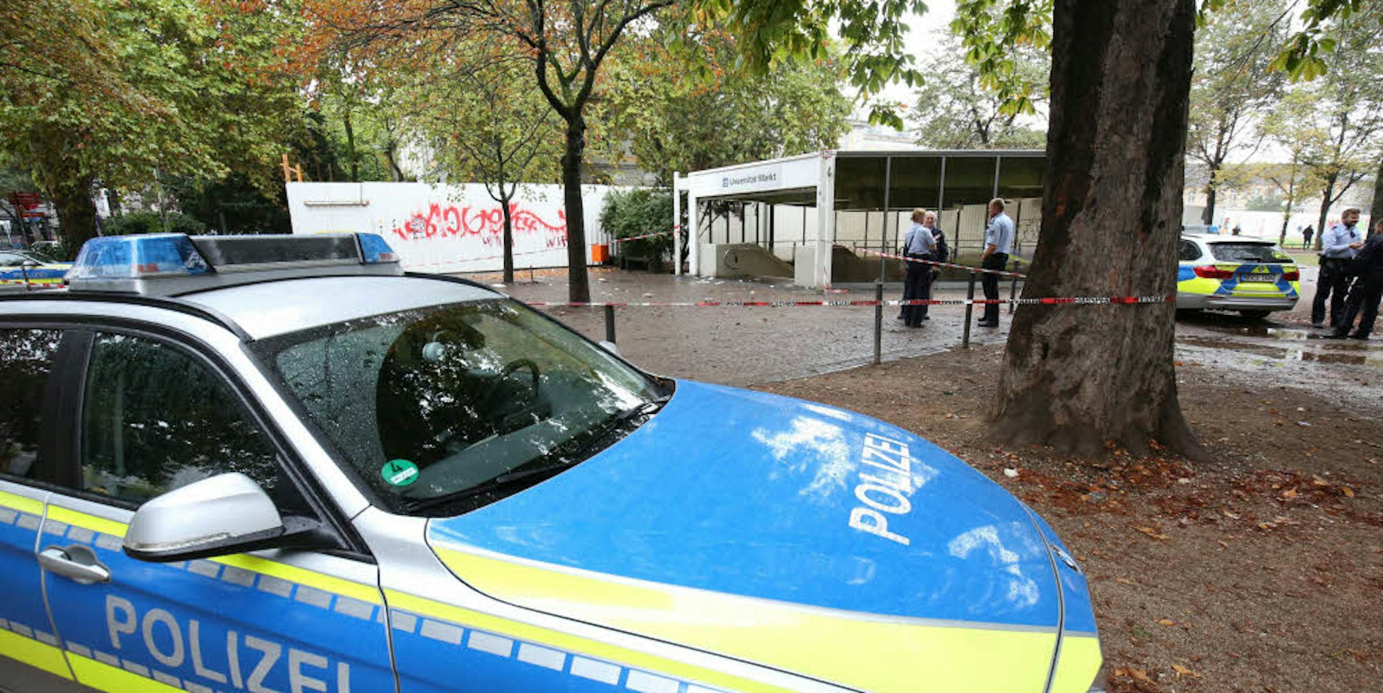 Rund um den U-Bahn-Zugang Universität/Markt am Bonner Hofgarten sicherte die Polizei am Sonntag nach der gewalttätigen Auseinandersetzung Spuren.