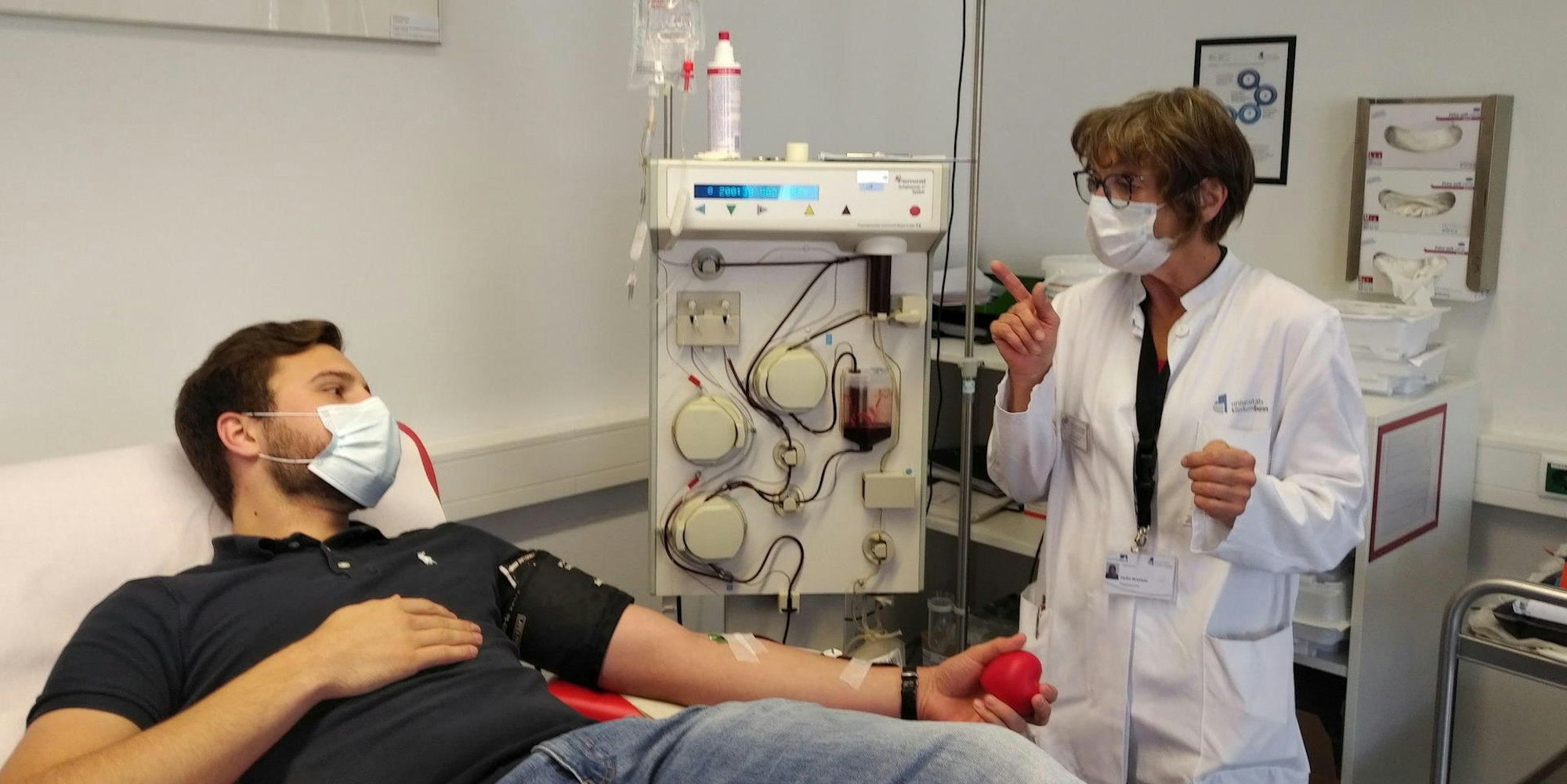 Einer der ersten Spender ist Jan K. Die Mitarbeiterin des Blutspendedienstes am Universitätsklinikum Bonn Heike Brüssler erklärt dem wieder genesenen Covid-19-Patienten den Ablauf der Plasmaspende.