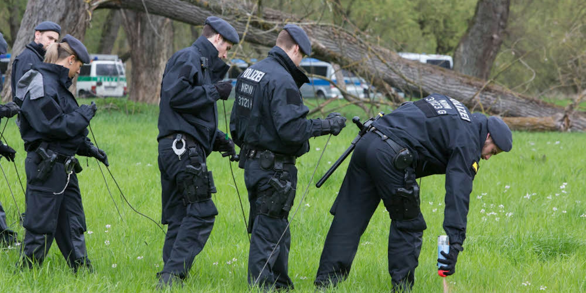 Polizisten einer Einsatzhundertschaft bei der Spurensuche in der Siegaue.