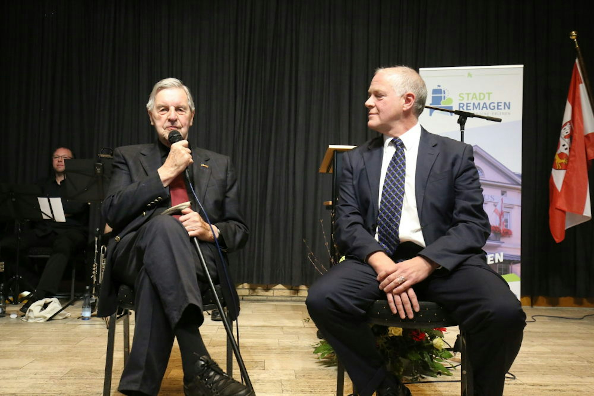 Beim Gedenken in Remagen interviewte Andrew Denison (r.) den 95-jährigen Dr. Jürgen Tegethoff aus Heisterbacherrott zu seinen Erlebnissen.