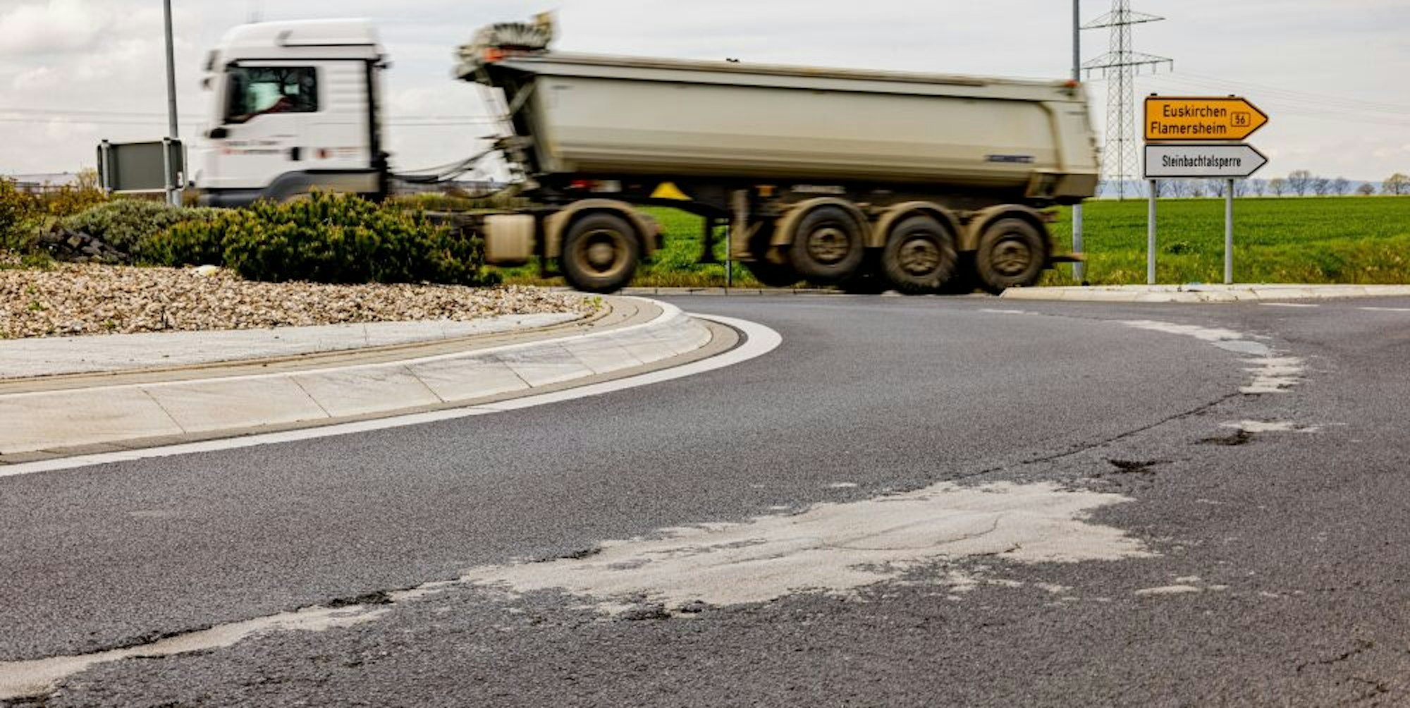 Deutlich sichtbar sind die Spuren die die Schwerlaster am Kreisel bei Essig hinterlassen haben.