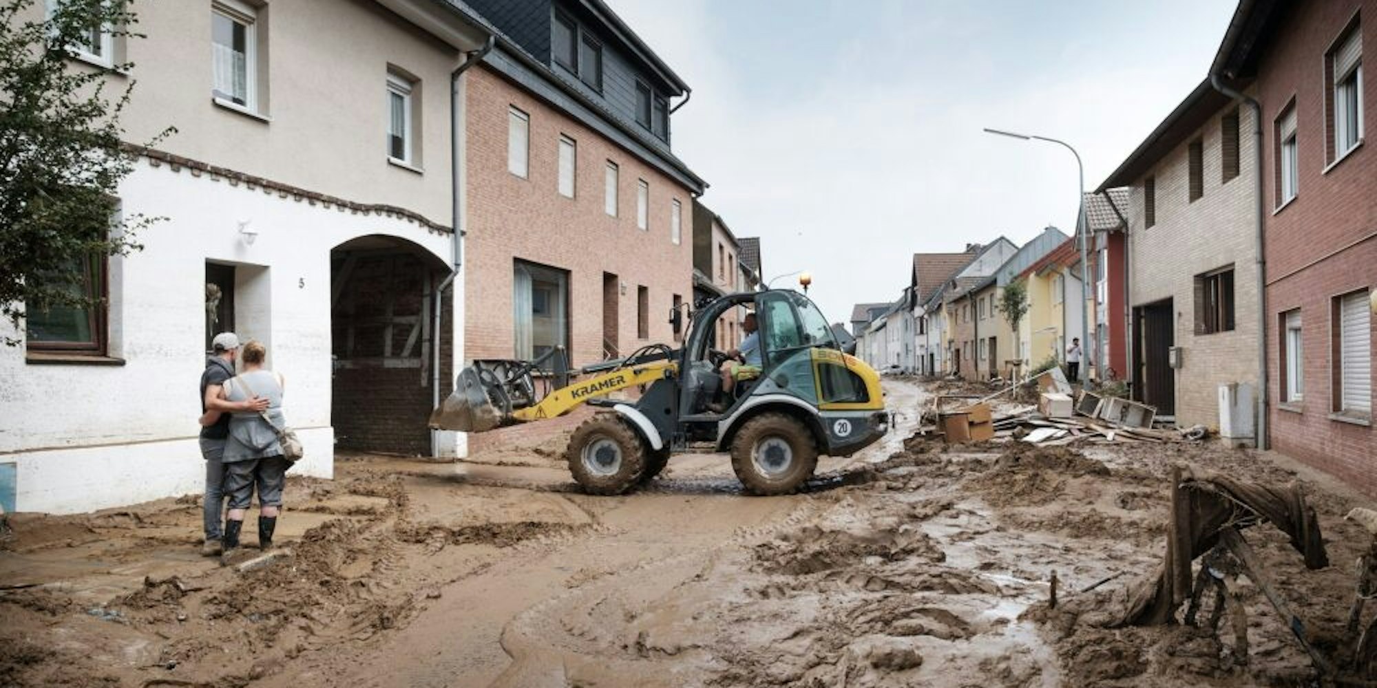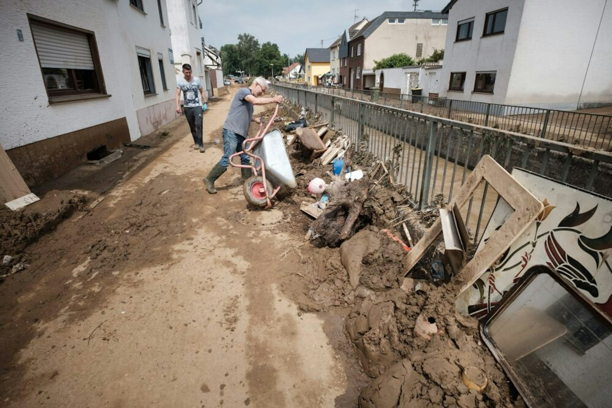 Allerdings wirkten sie hilflos, da keine Rettungskräfte in dem evakuierten Gebiet waren. Nur vereinzelt sperrten Polizisten die Straßen. Die Odendorfer waren auf sich allein gestellt. Einige transportierten den Matsch mit Schubkarren aus den Häusern. Andere schauten verzweifelt zu, wie es ein einziger Radlader mit den Schlammmassen vor den Gebäuden aufnahm.
