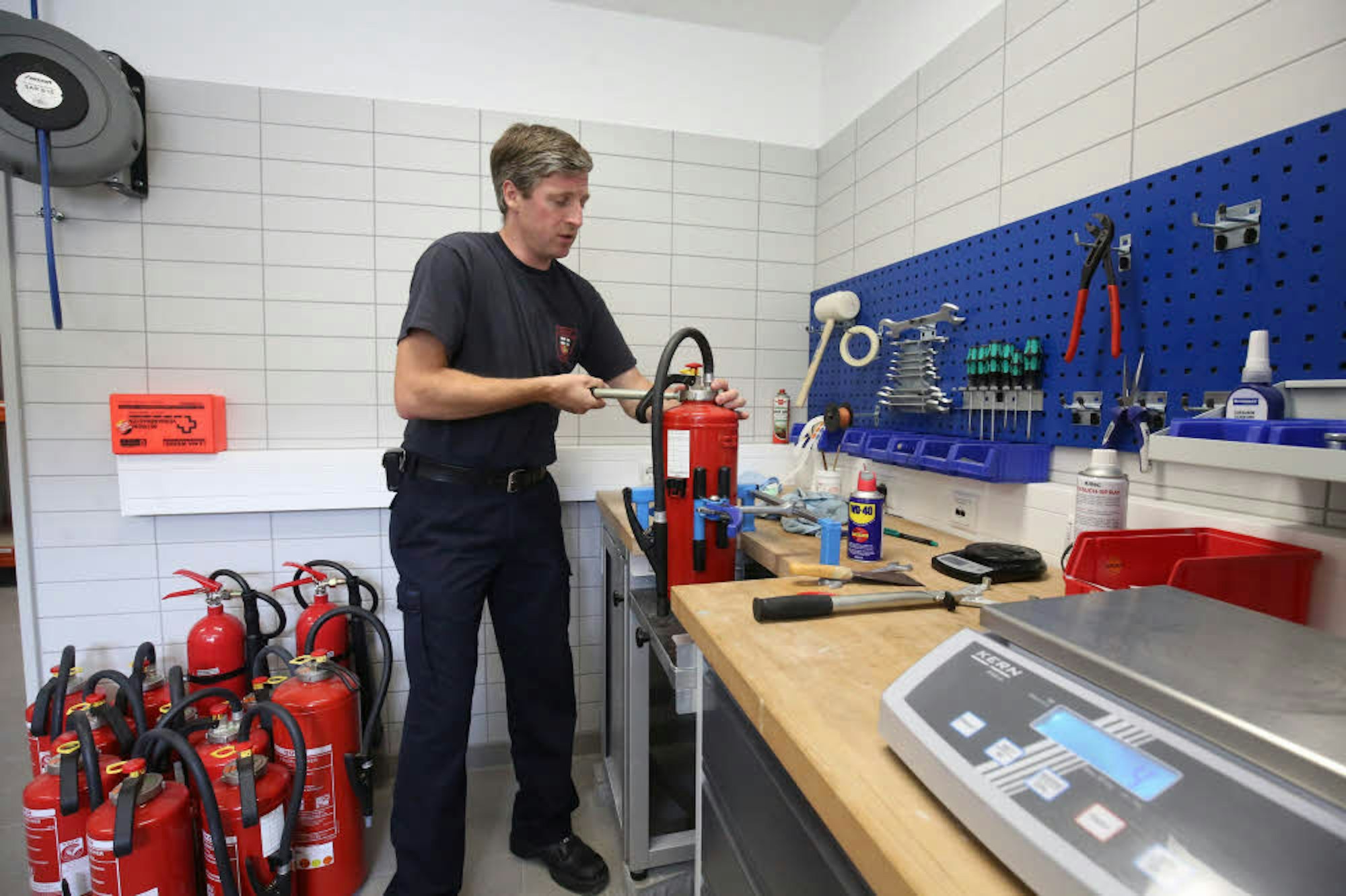 Viel Arbeit hat die Werkfeuerwehr auch ohne große Einsätze. In der Feuerlöscherwerkstatt etwa überprüft Sven Gombert gerade solche Geräte auf ihre Funktionstüchtigkeit.